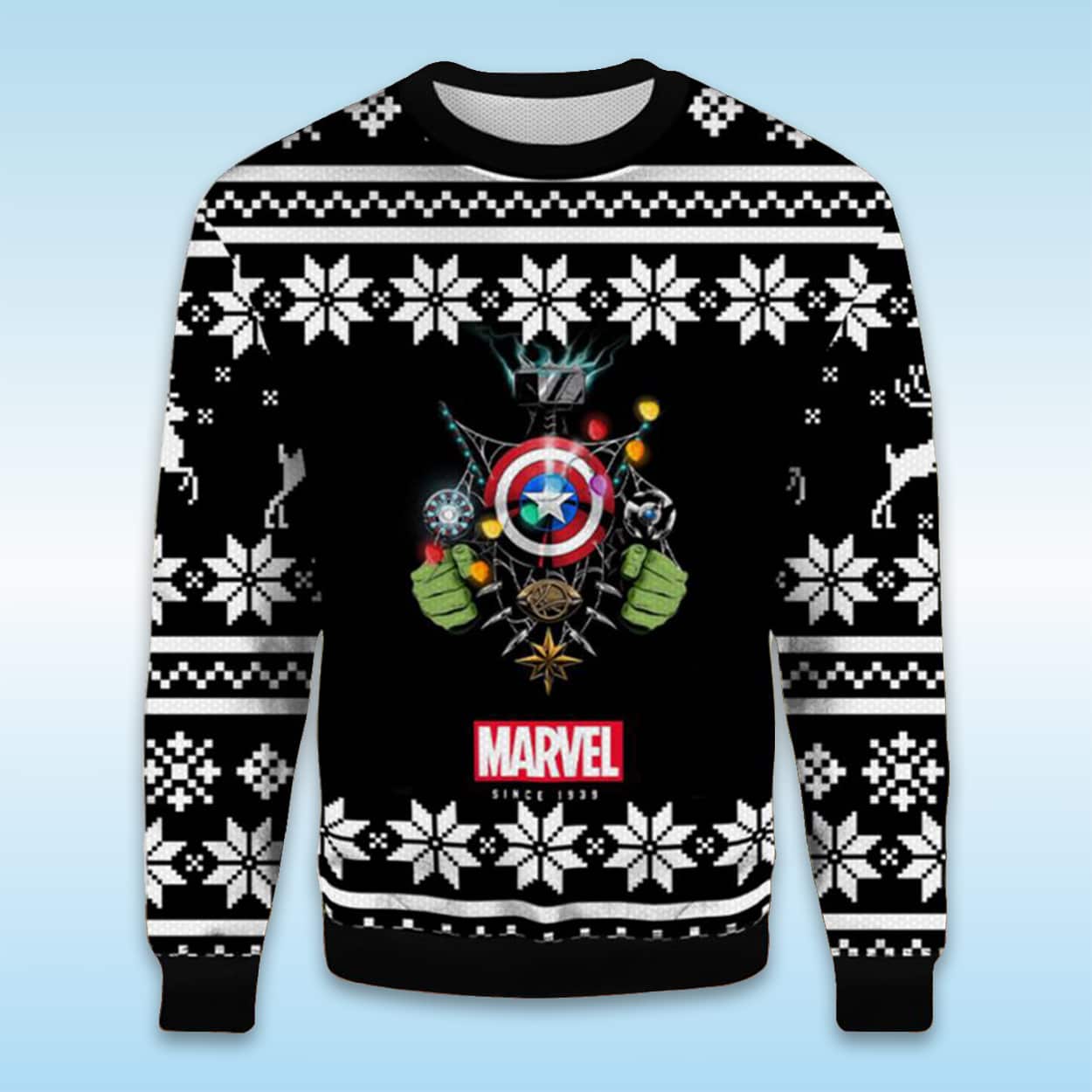 The sweater’s centerpiece unites symbols from Marvel legends—Captain America’s shield, Hulk’s fists, Iron Man’s arc reactor—each representing courage, sacrifice, and resilience. These icons reflect the evolution of heroism from wartime valor to modern-day justice and personal redemption.
