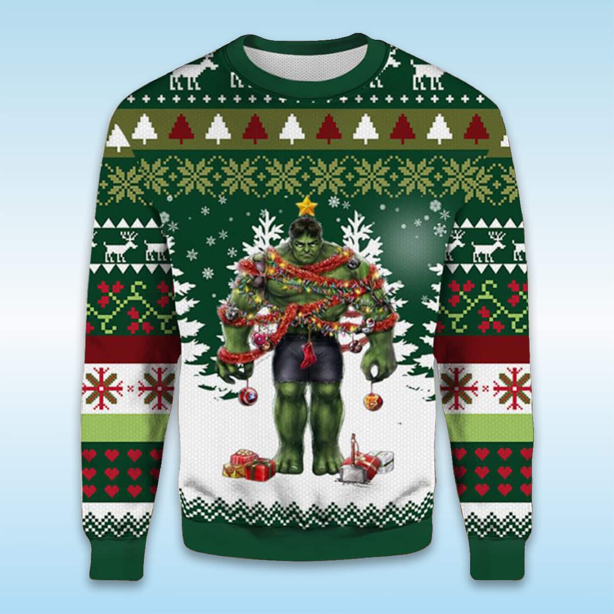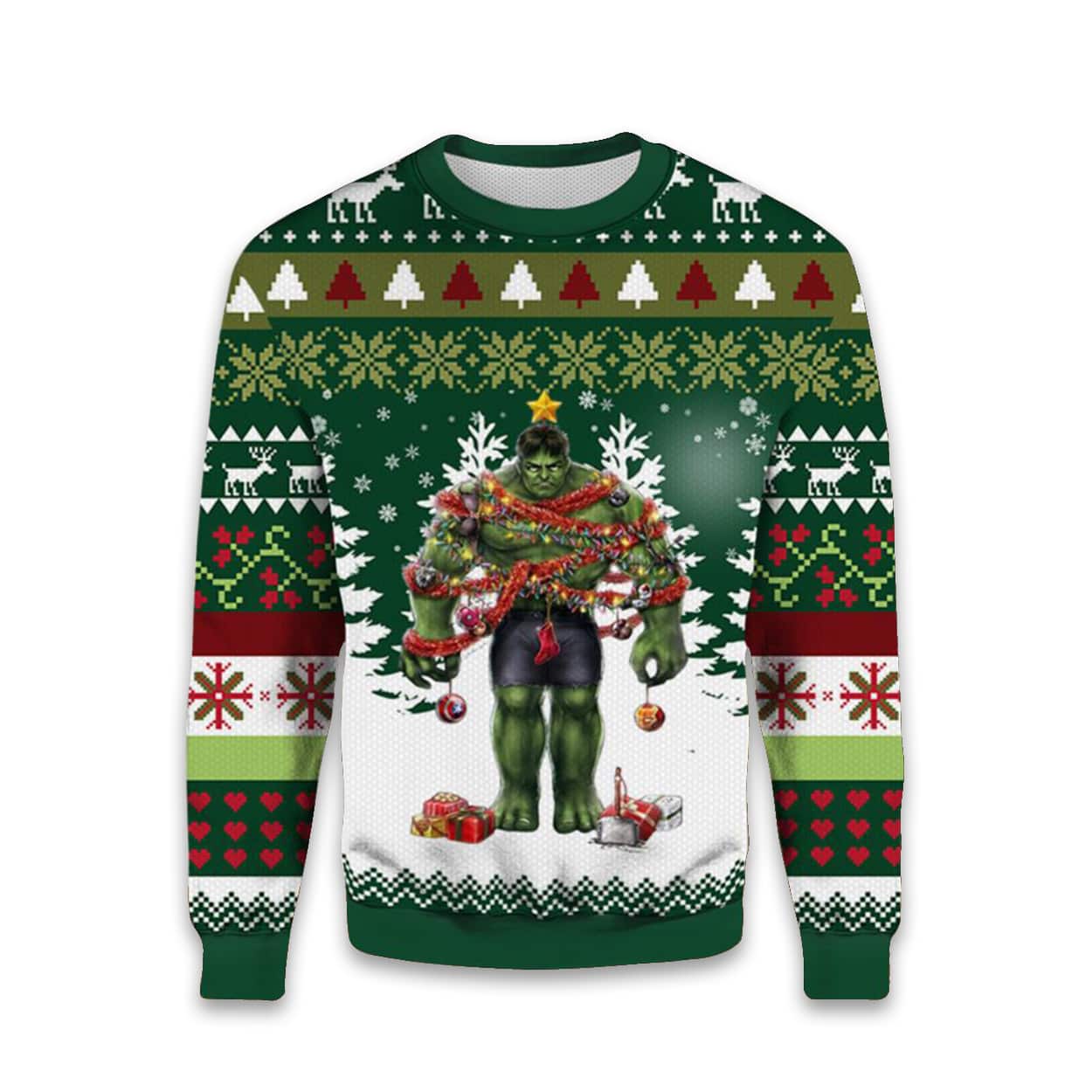 Unwrap laughter and nostalgia with the Marvel Merry Christmas Hulk Ugly Sweater. Featuring the green giant decked out as a holiday tree, this bold design fuses comic legacy with seasonal humor—perfect for fans who love quirky style and cultural storytelling.
