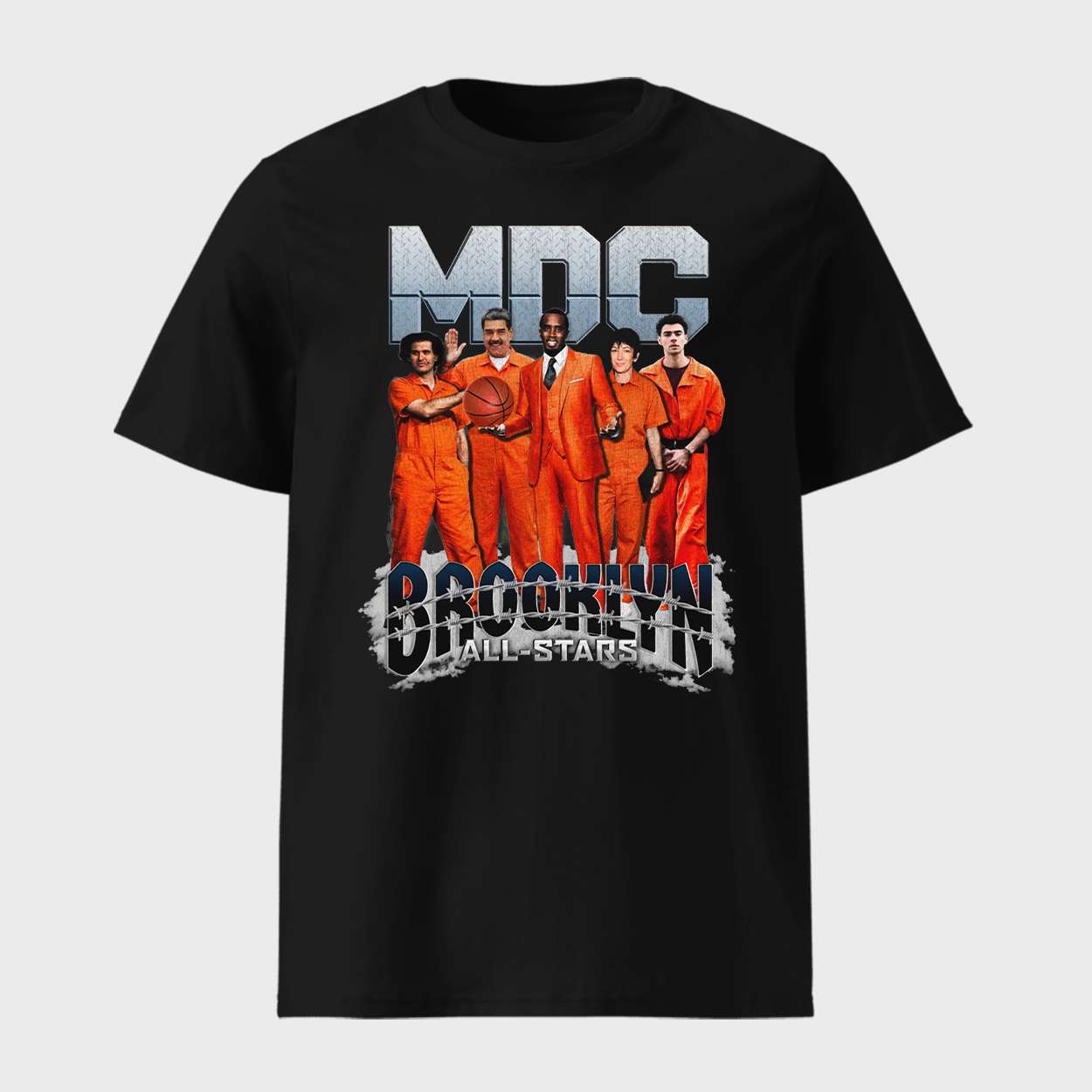 Bold and thought-provoking, the MDC Brooklyn All-Stars Shirt fuses gritty urban imagery with commentary on incarceration and talent. Featuring stylized figures in jumpsuits with a basketball and mic, it reflects the untold stories of resilience, creativity, and community behind prison walls.