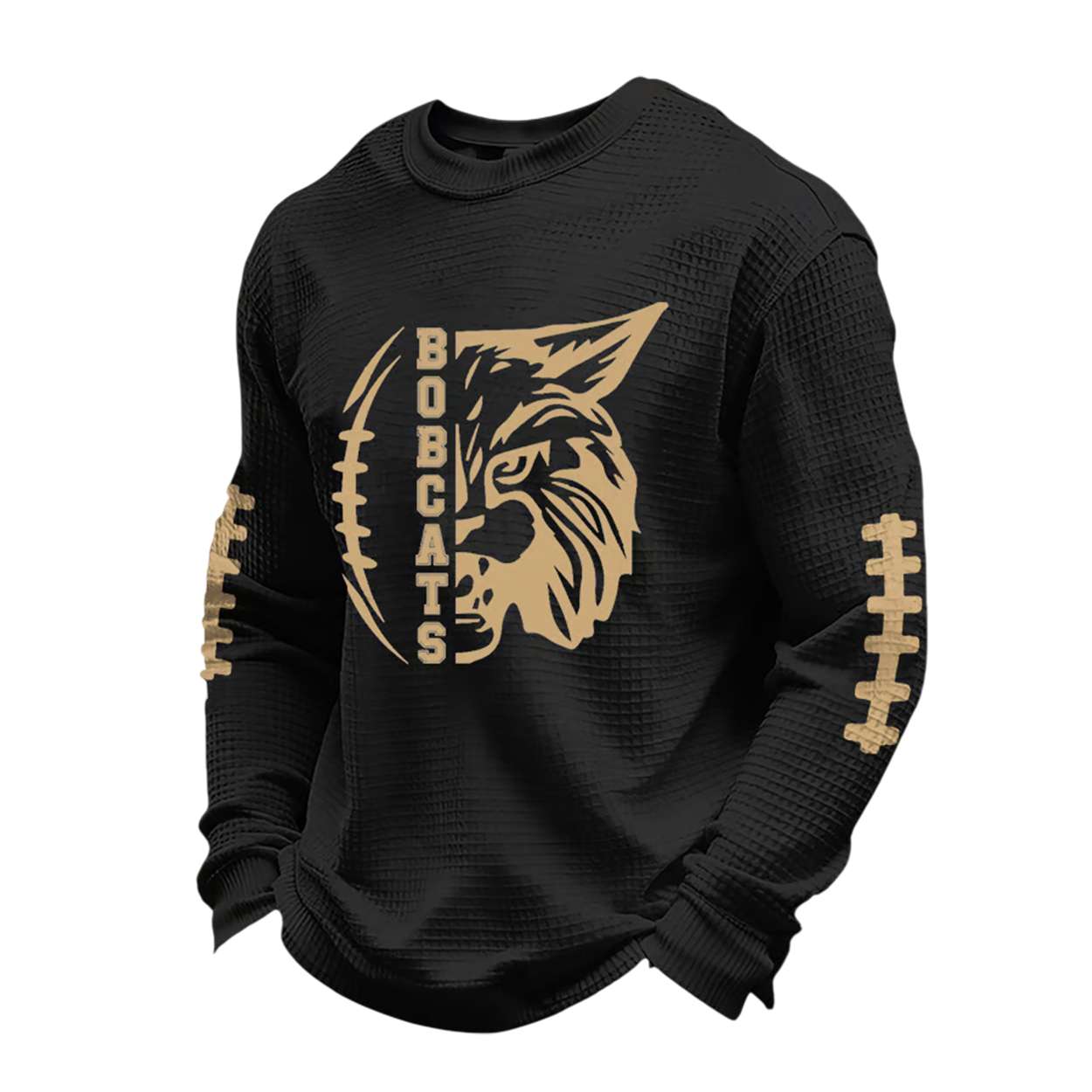 Show your pride with the Men’s Bobcats Football Print Waffle Sweatshirt—featuring bold graphics inspired by community-driven sports culture. This design honors the grit of local football heroes and the legacy of small-town rivalries that shaped regional identity.