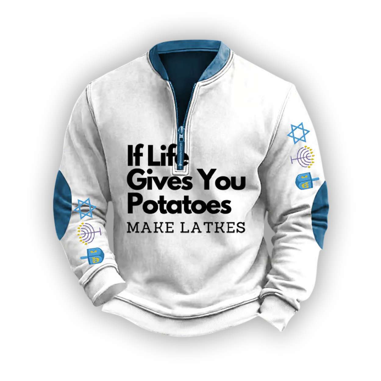 The phrase “If Life Gives You Potatoes Make Latkes” isn’t just clever—it’s a nod to resilience. Latkes, rooted in Eastern European Jewish kitchens, became a symbol of resourcefulness during times of scarcity. This pullover honors that enduring spirit with style.