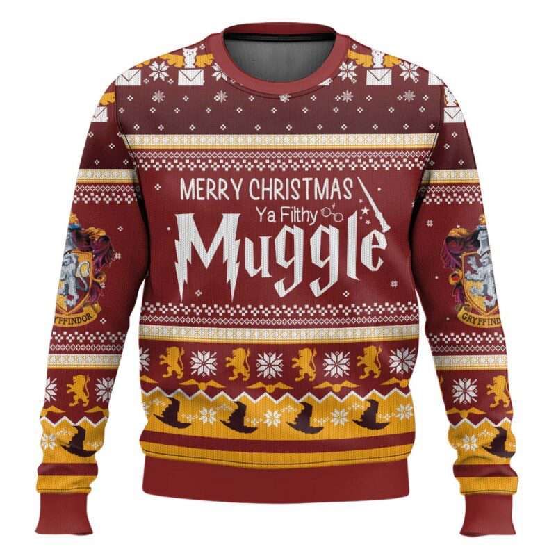 This Merry Christmas Muggle Ugly Christmas Sweater is a fun and magical twist on the classic holiday garment. Inspired by the iconic phrases from the wizarding world, it features the cheeky āYa Filthy Muggleā sentiment, making it perfect for Harry Potter fans who love to express their magical side even during the holidays. The sweater brings the magic to life with its detailed design, complete with Gryffindor house symbols and festive snowflakes.