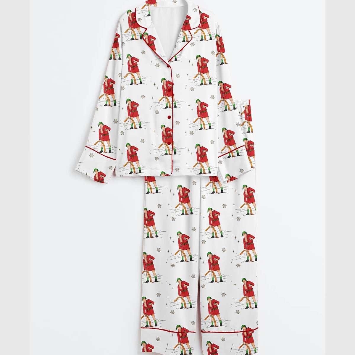 This pajama set features a mischievous character in a red coat and green hat, channeling Cousin Eddie’s unforgettable scene from National Lampoon’s Christmas Vacation. A nod to 1980s comedy, it captures the absurdity and charm of dysfunctional family traditions.