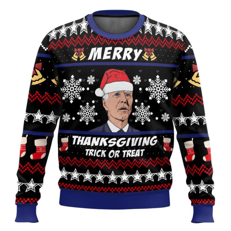 Stand out this holiday season with the Merry Thanksgiving Biden Ugly Christmas Sweater. Featuring a humorous mix of Thanksgiving, Halloween, and Christmas elements, it nods to modern politics, cultural mashups, and the quirky ways Americans express humor during festive traditions.