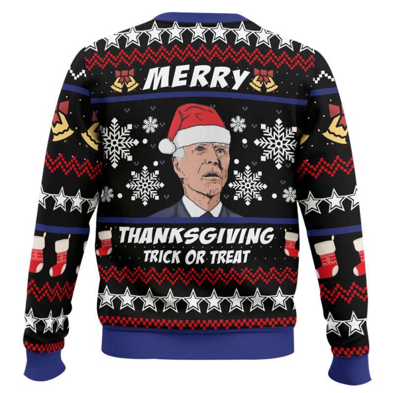 This design showcases President Joe Biden in a Santa hat, paired with playful text that humorously mixes holidaysââMerry Thanksgivingâ and âTrick or Treat.â It reflects the lighthearted confusion of modern celebrations where traditions often blend, sparking conversation and laughter among family gatherings.