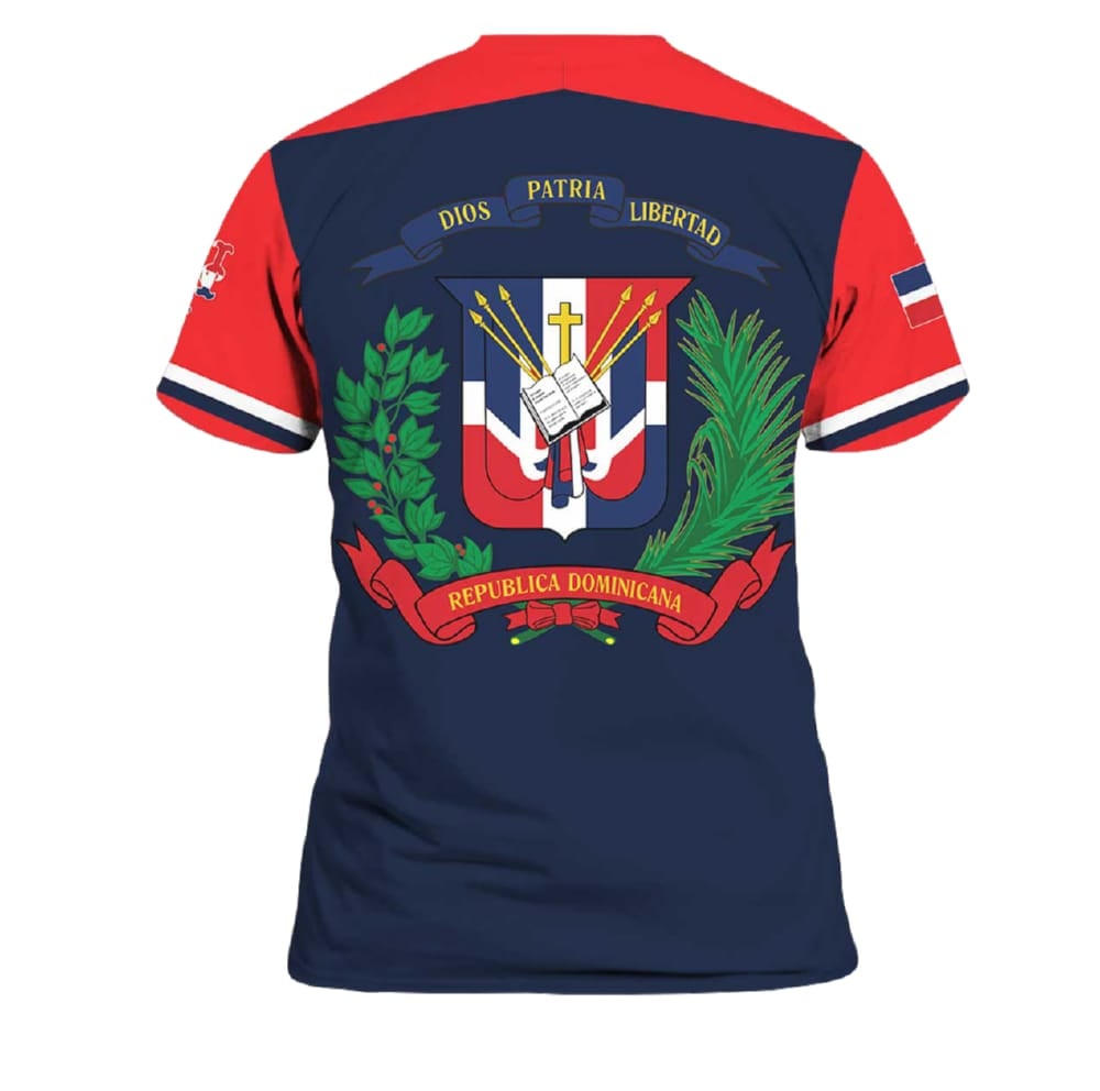 Inspired by the pride and energy of the Dominican Republic, the back of the shirt displays the country’s official coat of arms. This emblem is not just a symbol of national unity; it’s also a powerful reminder of the Dominican Republic’s rich history and commitment to liberty. The addition of the slogan “Dios, Patria, Libertad” (God, Fatherland, Liberty) makes this shirt a personal statement of freedom and pride.