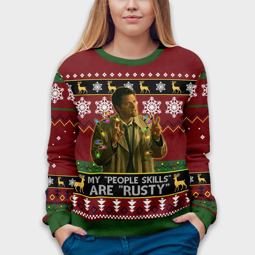 Fans of Supernatural will instantly recognize the awkward charm of Castiel, the angel portrayed by Misha Collins. Known for his unintentional humor and struggle with human interaction, this sweater immortalizes his memorable line, “My people skills are rusty,” making it a perfect nod to his character’s legacy.