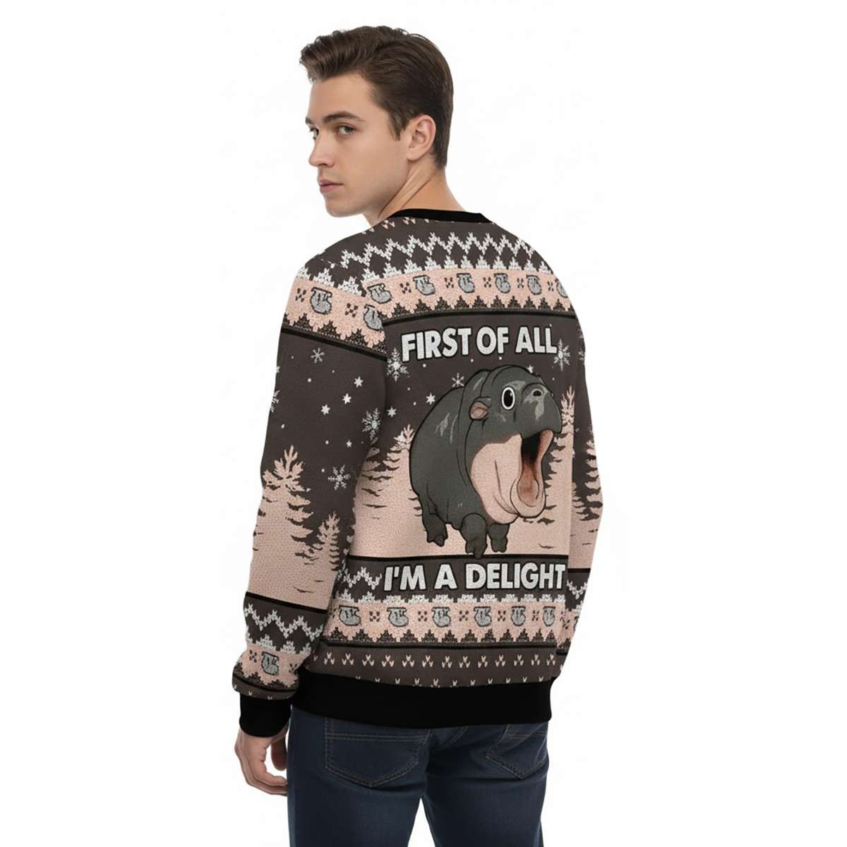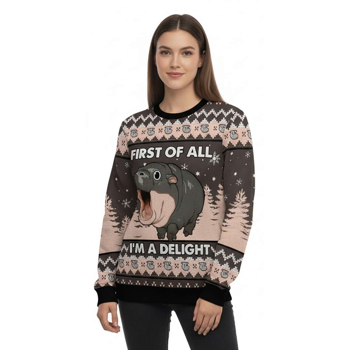 Moo Deng First Of All I’m A Delight Ugly Christmas Sweater – Bold Humor Meets Holiday Sass
