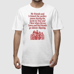 Take a trip down memory lane with the My Friends And I Chased The Perfect Pause During The Scene In Now Shirt. This T-shirt captures a key moment from the 1995 classic Now and Then, a coming-of-age film that resonated with many in the 90s. The shirt highlights the unforgettable skinny-dipping scene involving Devon Sawa and his friends, immortalized as one of the most iconic moments of the movie. Fans of this nostalgic film will instantly recognize and appreciate the reference, making it a must-have item.