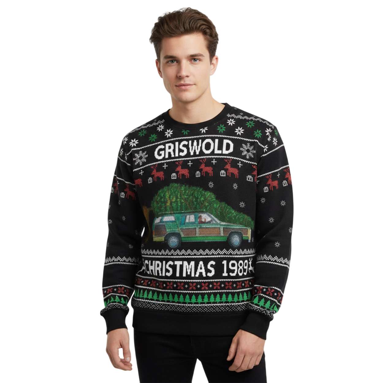 Clark Griswold’s green station wagon hauling an oversized tree captures the essence of National Lampoon’s Christmas Vacation. This sweater immortalizes the moment when ambition met absurdity, reminding us how far one man would go for a “perfect” holiday.