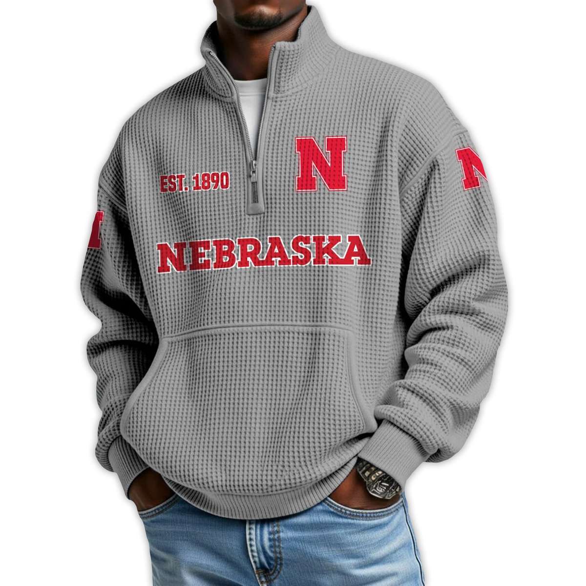 Show your pride with the Nebraska Football Est 1890 Waffle Stand Collar Half Zip Sweatshirt. Featuring bold collegiate graphics, this pullover honors a legacy of grit, iconic players, and a program rooted in Midwestern strength and historic transformation.