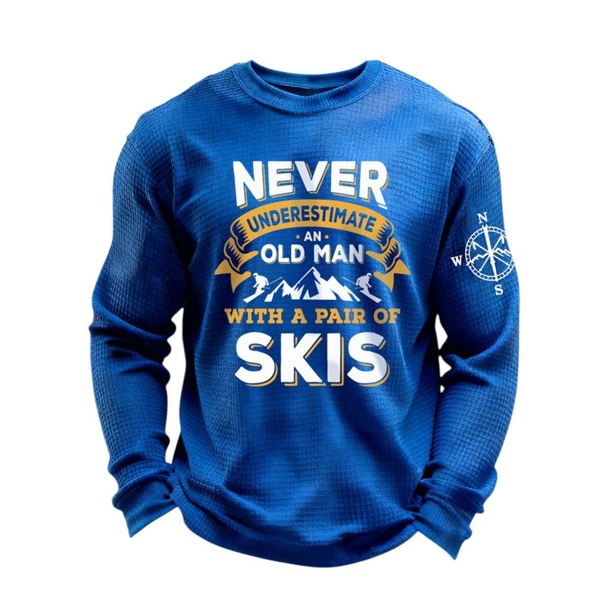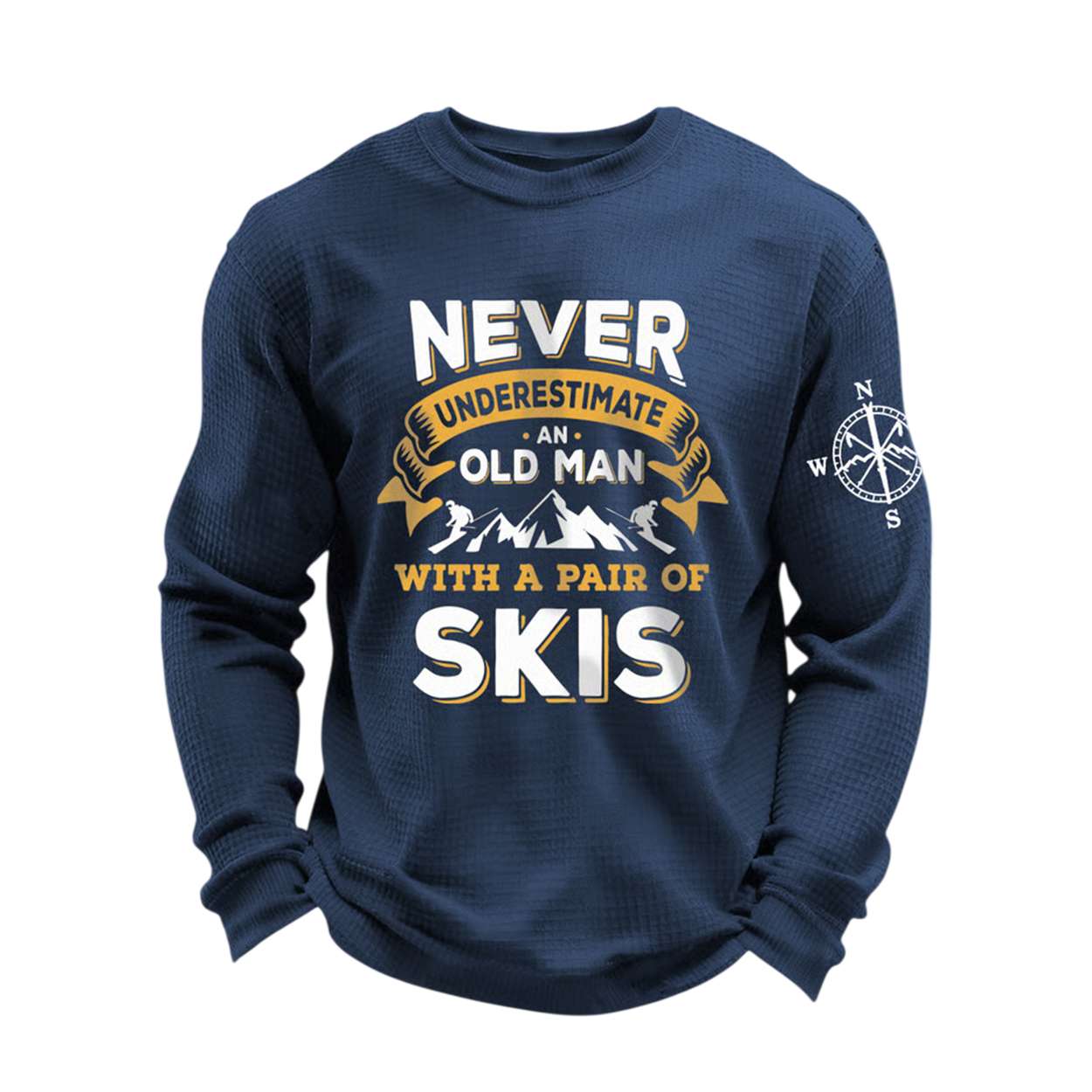 Channel alpine grit with the Never Underestimate An Old Man With A Pair Of Skis Waffle Long-Sleeve T-Shirt. This bold design honors seasoned skiers, mountain legends, and the enduring spirit of winter sports. A tribute to age-defying adventure and rugged independence.