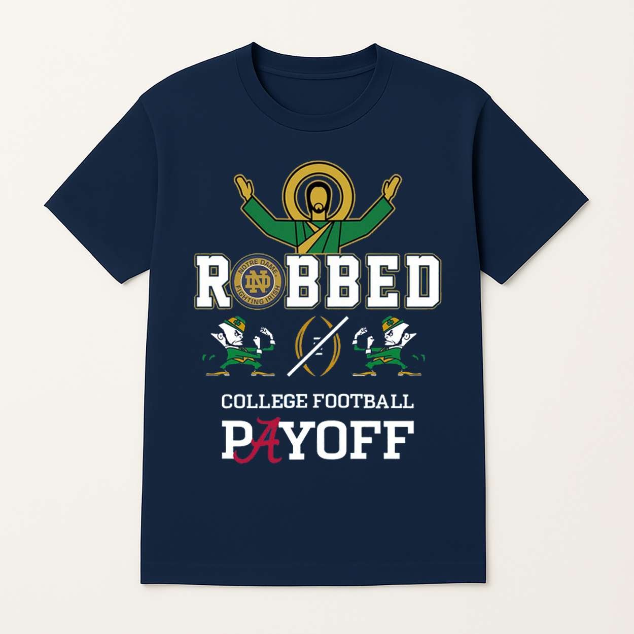This shirt captures the sting of exclusion felt by Notre Dame fans during a contentious College Football Playoff decision. The bold “ROBBED” graphic and symbolic logos reflect widespread debate over fairness, rankings, and institutional bias in college athletics.