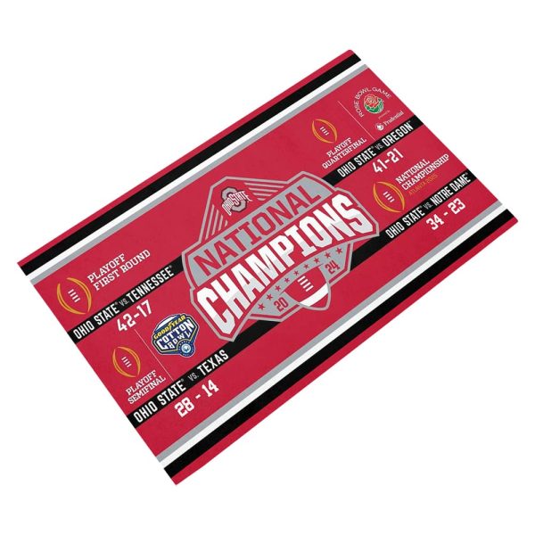 Celebrate a monumental victory with the Ohio State National Champions 2024 Doormat. This collectible doormat commemorates the Ohio State Buckeyes’ remarkable journey through the playoffs, showcasing their wins against fierce competitors like Tennessee, Texas, and Notre Dame. Each game’s score is boldly displayed, making this a piece of history every Buckeye fan will cherish. Designed in vibrant red and gray, Ohio State’s iconic colors, it features official logos and a declaration of their national championship status, blending style with spirit.