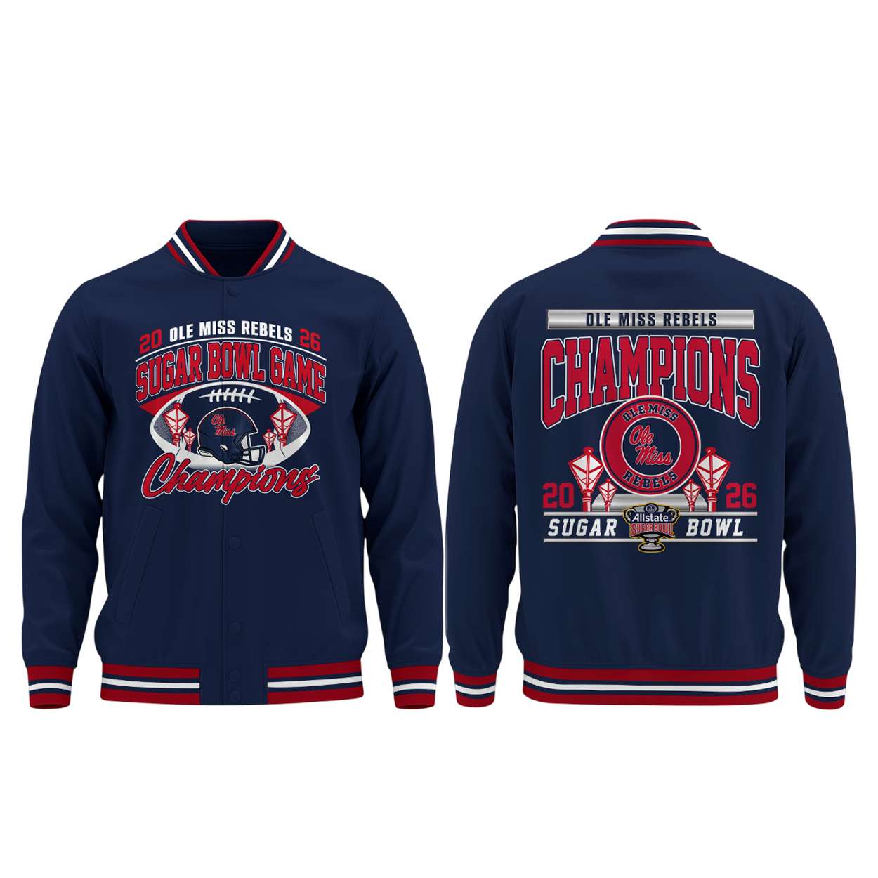 Honor Ole Miss’s triumphant 2026 Sugar Bowl win with the Ole Miss 2026 Allstate Sugar Bowl Champions Bomber Jacket. Featuring bold graphics and historic flair, this jacket commemorates standout performances by Trinidad Chambliss and Will Echoles in a season that reshaped college football’s playoff narrative.