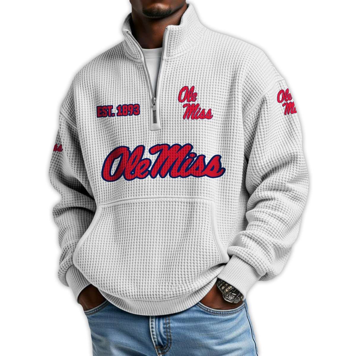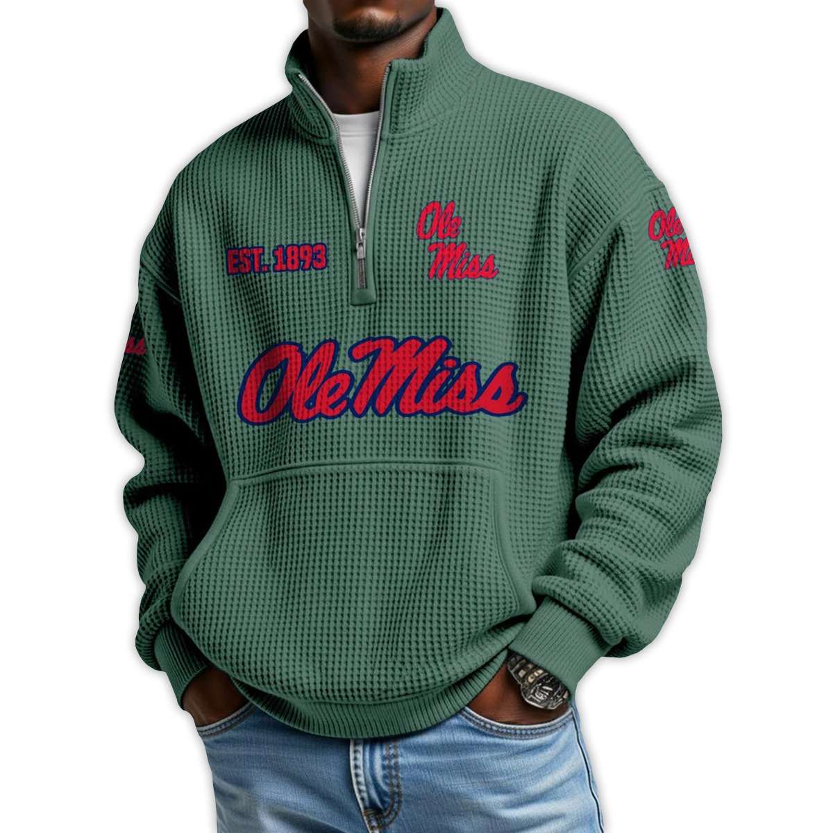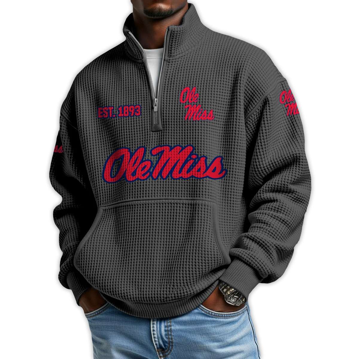 Show your pride with the Ole Miss Football Est 1893 Waffle Stand Collar Half Zip Sweatshirt. Featuring bold collegiate graphics, this pullover honors a legacy of Southern grit, iconic athletes, and a university rooted in resilience and cultural transformation.
