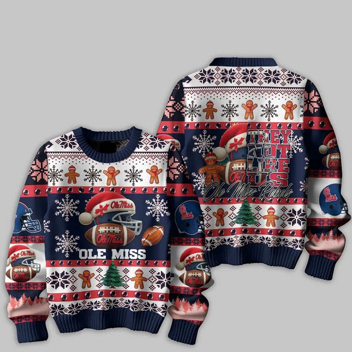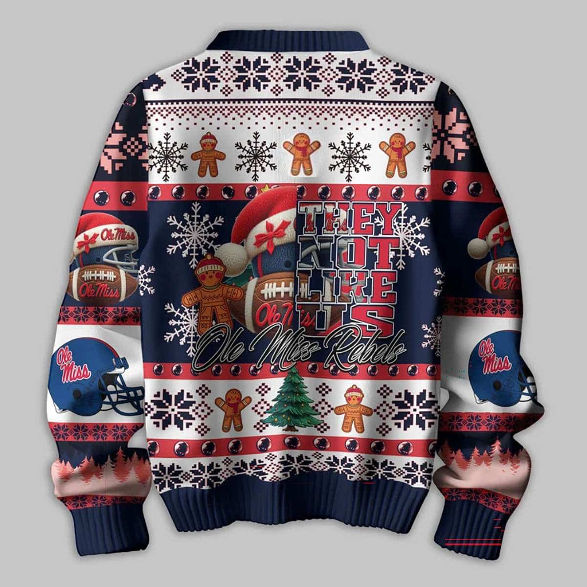 Show your Ole Miss pride this winter with the Ole Miss Football They Not Like Us Christmas Ugly Sweater. Featuring bold Rebels graphics, festive icons, and a nod to football grit, this design blends team spirit with seasonal flair for fans who stand apart.