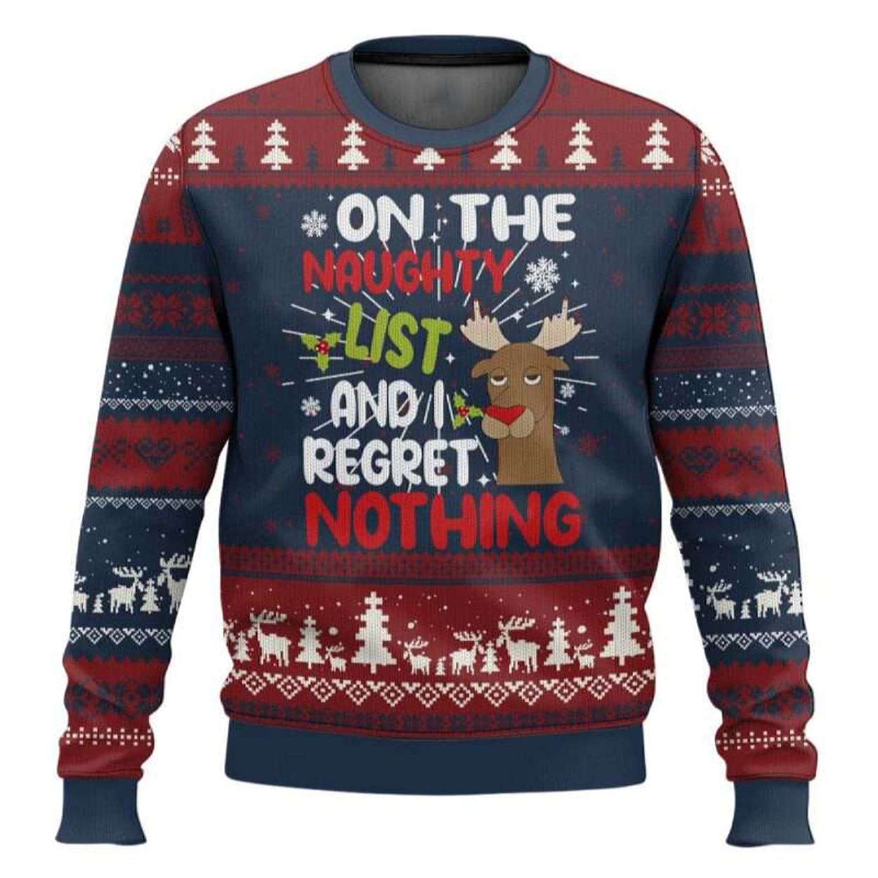 This quirky reindeer ugly Christmas sweater declares: On the Naughty List and I Regret Nothing. Inspired by holiday mischief and festive traditions, it’s a bold nod to winter humor, pop culture’s playful rebels, and the history of cheeky seasonal gatherings.