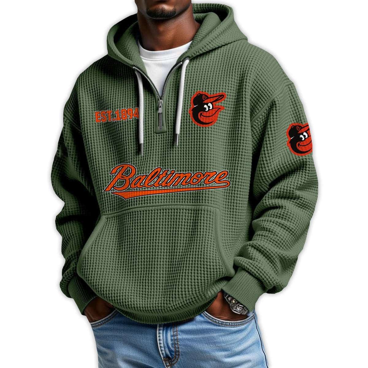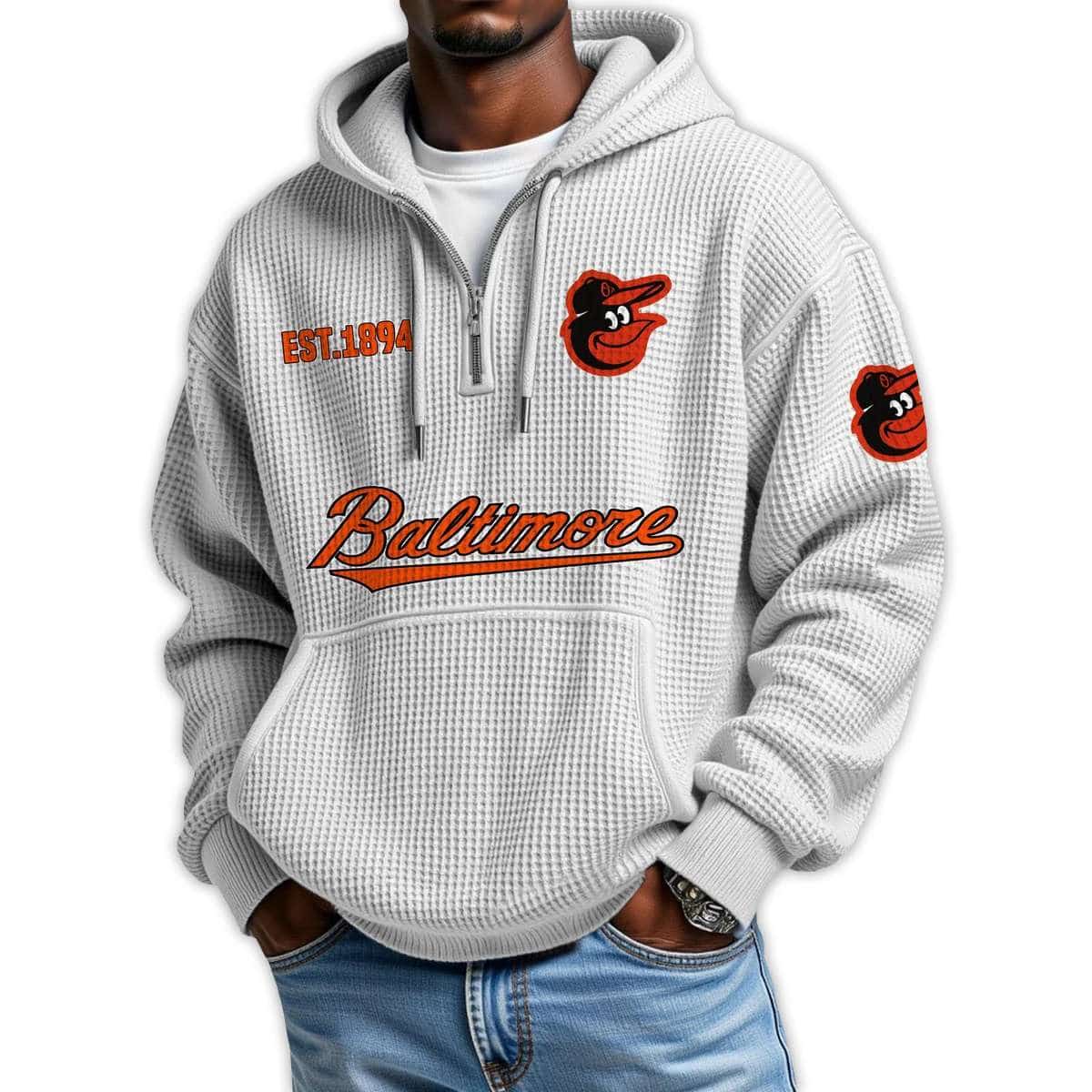 Show your pride with the Orioles Est 1894 Quarter Zip Waffle Hoodie. Featuring iconic Baltimore graphics and historic emblems, this hoodie connects fans to legendary players, pivotal seasons, and the enduring spirit of a team rooted in community and perseverance.