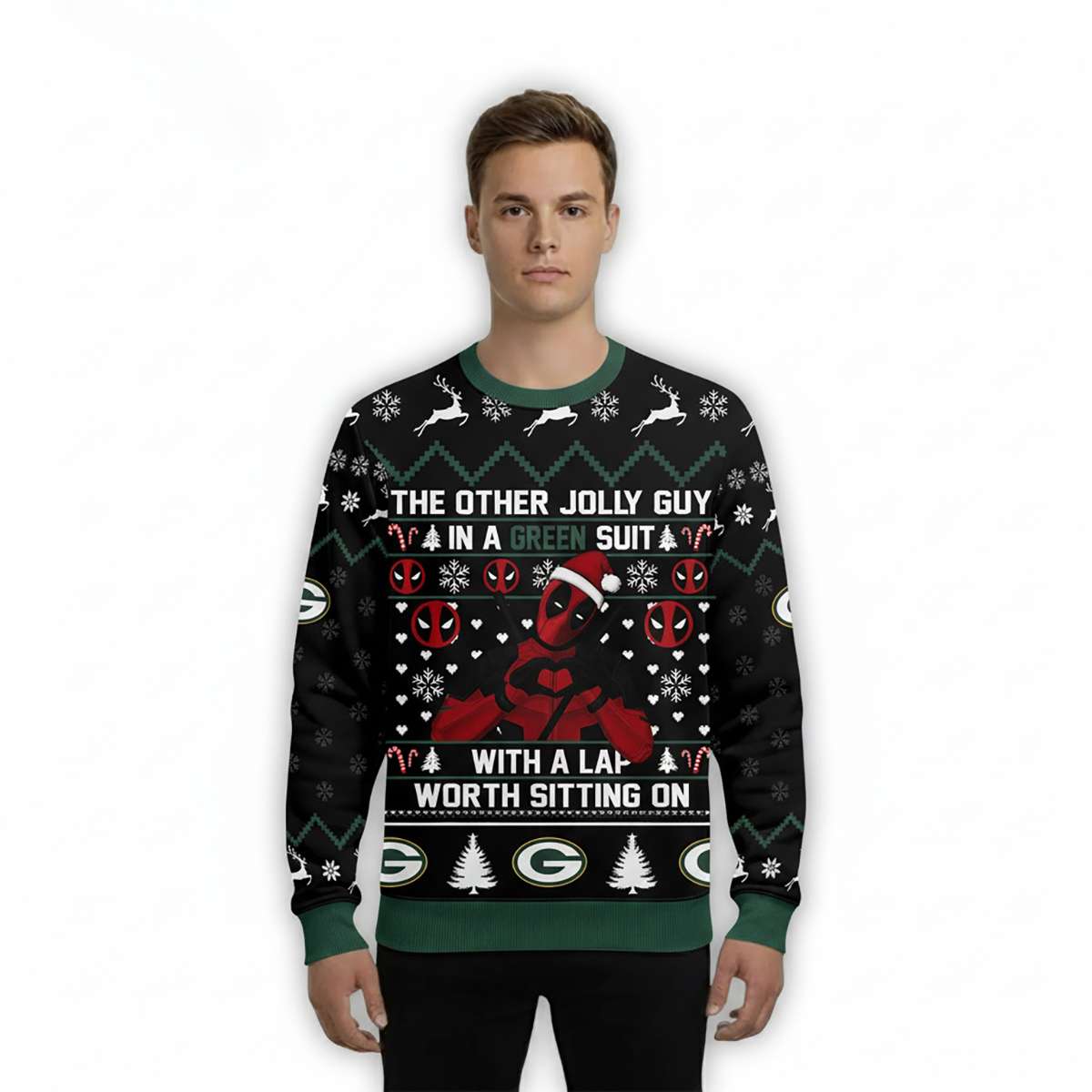 Get festive with the Packers Deadpool The Other Jolly Guy In A Green Suit Christmas Ugly Sweater. Featuring Marvel’s witty antihero in green, this bold design fuses football pride, comic mischief, and holiday charm. A must-have for fans who love humor, history, and unapologetic style.