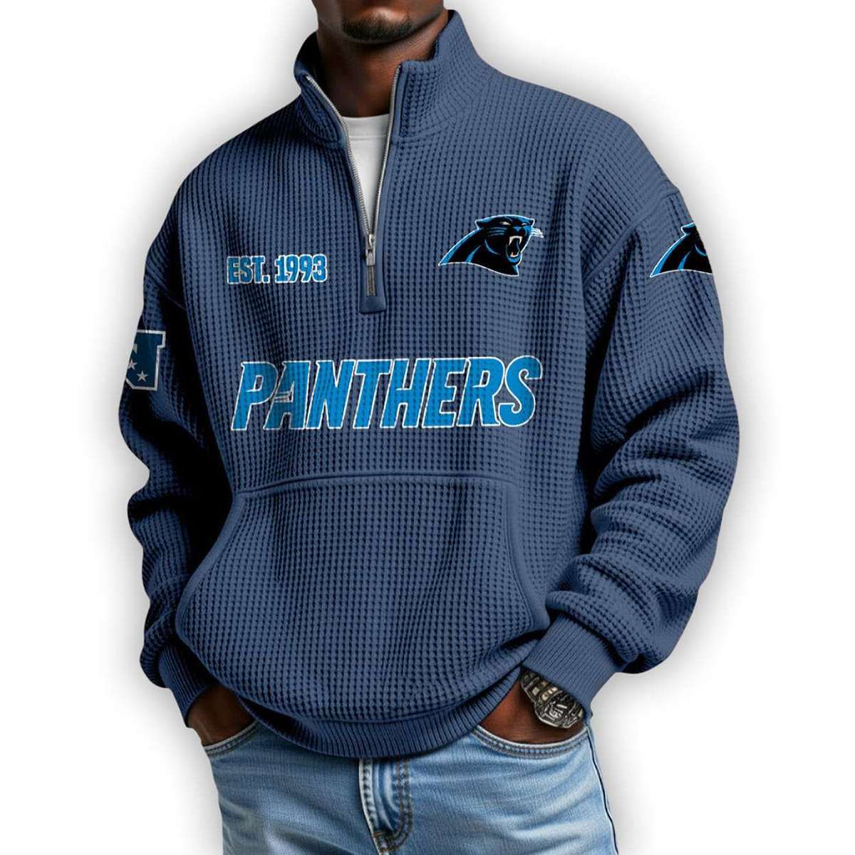 The Panthers Est 1993 Waffle Stand Collar Half Zip Sweatshirt honors Carolina’s football roots with bold graphics and historic references. This design connects fans to a team built on grit, leadership, and the enduring spirit of Southern pride and resilience.