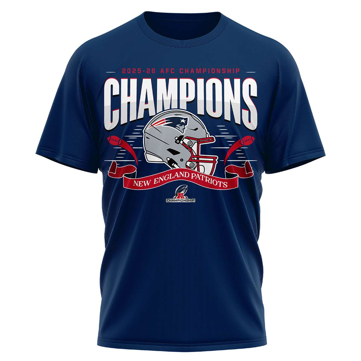 The front design captures the essence of the 2025-26 campaign—Patriots helmet blazing beneath a bold “CHAMPIONS” banner. It marks a season where tactical brilliance and unwavering focus propelled New England to the top of the American Football Conference.