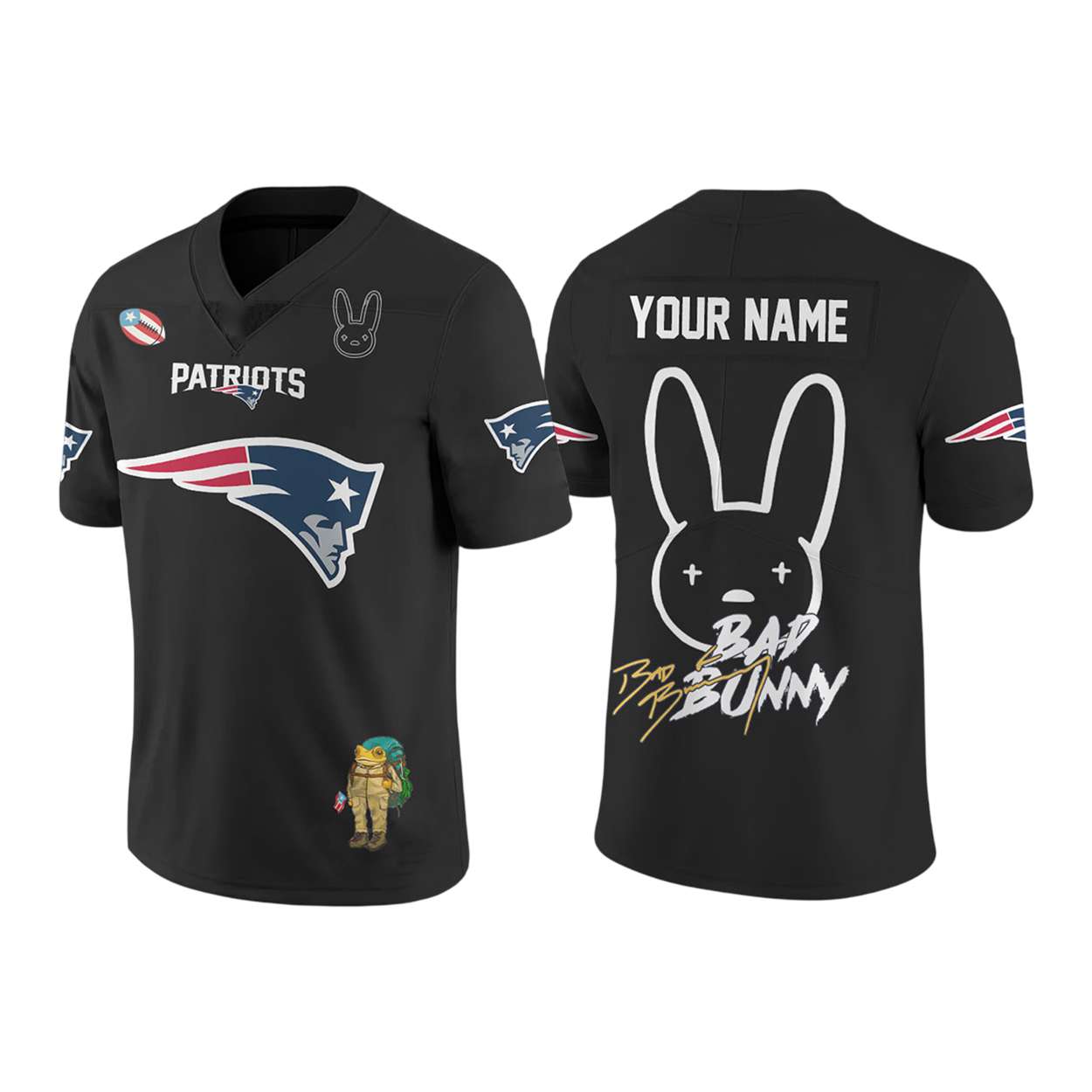 This jersey marks a cultural crossover—Bad Bunny’s electrifying Super Bowl LX halftime show paired with the Patriots’ return to Levi’s Stadium. The design blends team pride with Benito’s signature visuals, creating a wearable homage to music, sport, and identity.