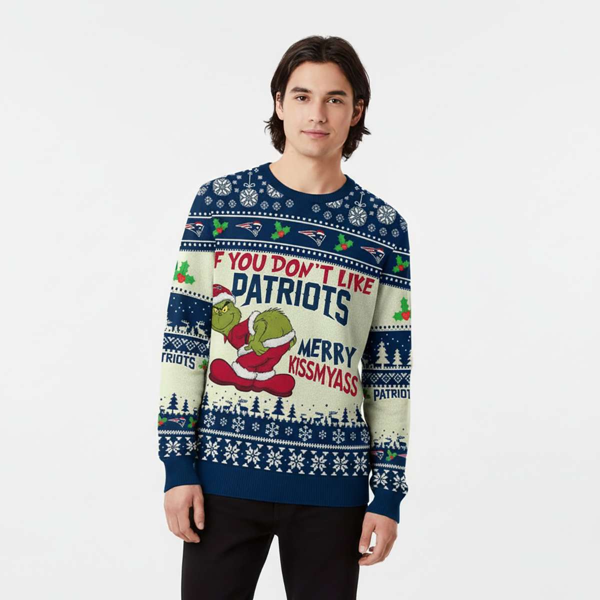 Add a rebellious twist to your winter wardrobe with the Patriots Grinch Merry Kissmyass Ugly Sweater. Featuring the iconic Grinch and bold New England pride, this design blends holiday sarcasm with sports loyalty for fans who embrace humor, grit, and cultural edge.