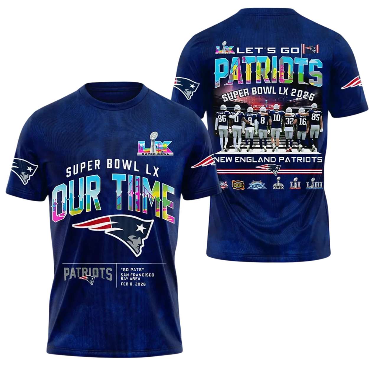 This shirt marks a pivotal moment in Patriots history—Super Bowl LX in San Francisco Bay Area. The phrase “OUR TIME” bursts across the front, echoing the team’s renewed ambition and the fans’ unwavering belief in their journey forward.