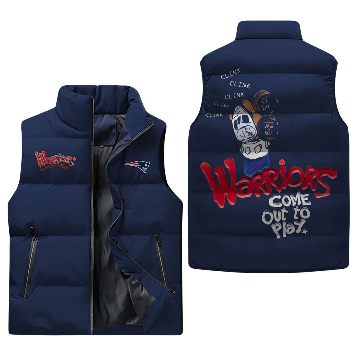 The Patriots Warrior Come Out And Play Puffer Jacket fuses sports culture with cinematic history. Inspired by the iconic chant from The Warriors film and team rivalries, this jacket embodies resilience, unity, and the spirit of competition, making it a bold statement piece for socially aware fans.