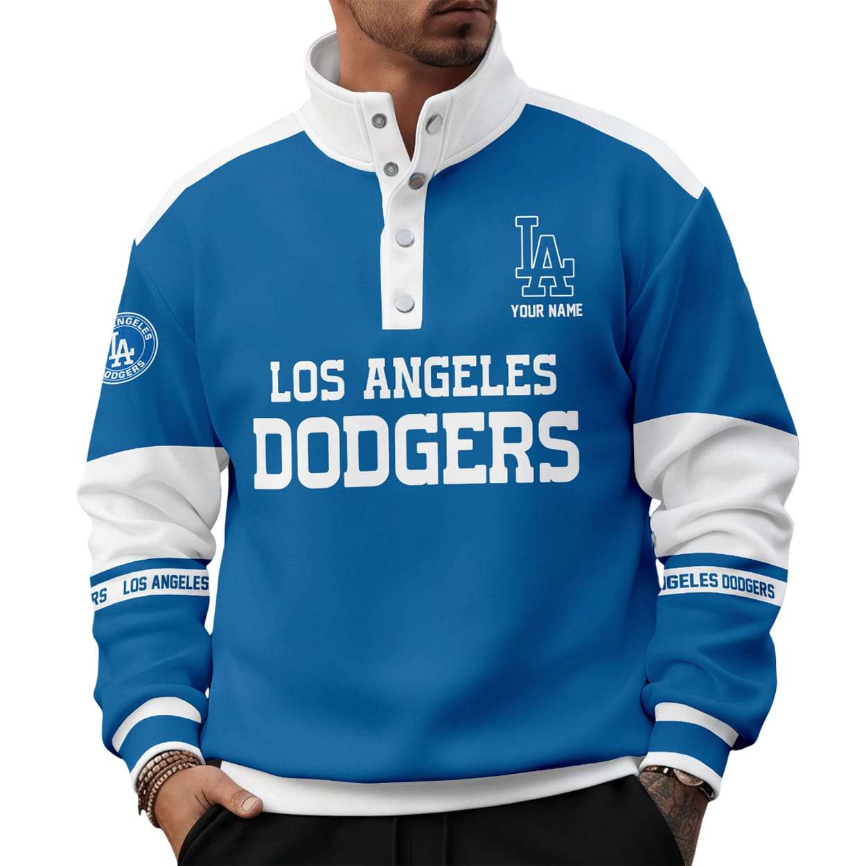 Circular sleeve patches and repeating text bands nod to the Dodgers’ enduring presence in American sports. Worn during playoff runs and street rallies alike, this piece channels the energy of a city that never stops believing.