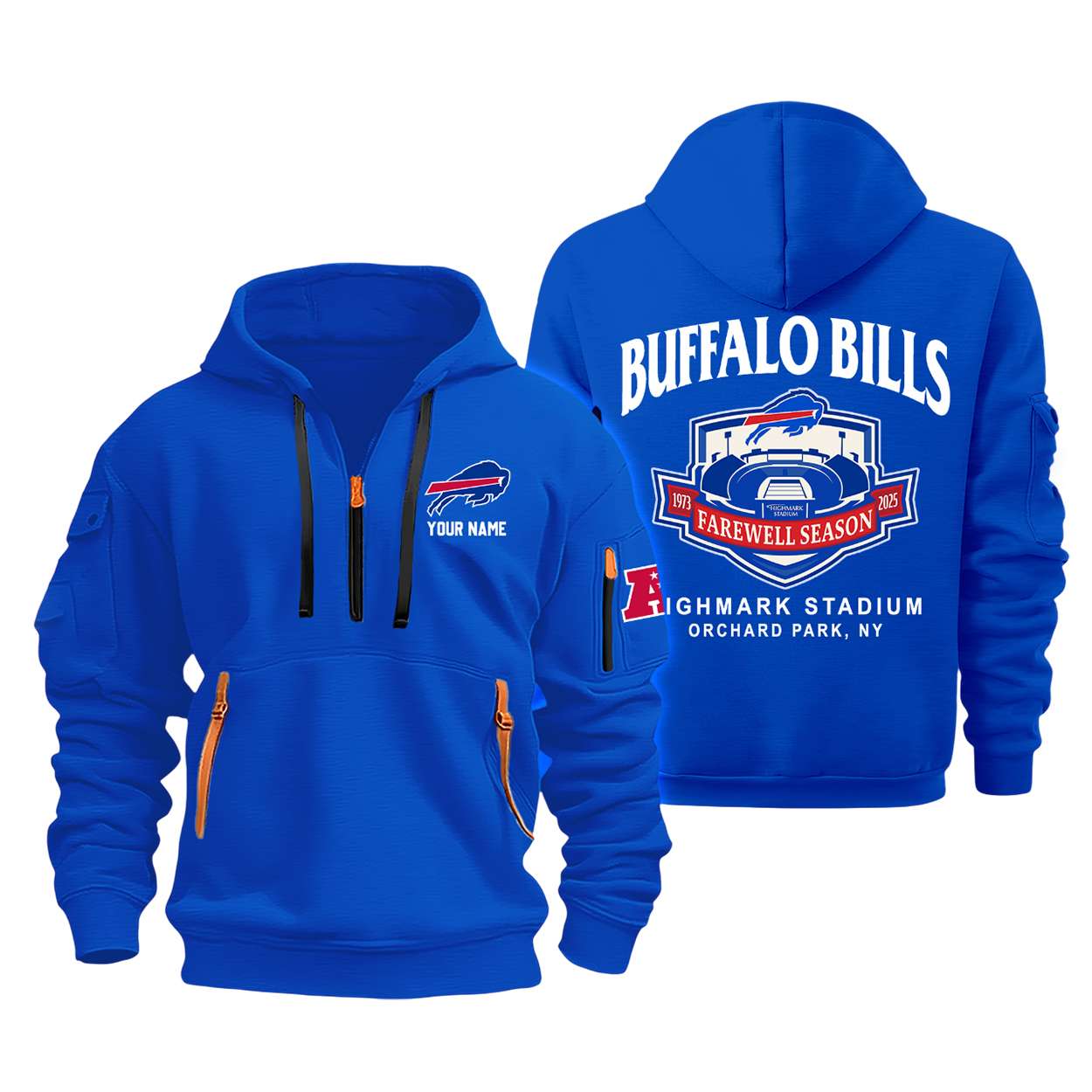 Honor the legacy of Highmark Stadium with the Personalized Bills 1973-2025 Farewell Season Quarter Zip Hoodie. Featuring iconic graphics and customizable details, this hoodie pays tribute to decades of unforgettable moments in Orchard Park, NY. A must-have for true fans.