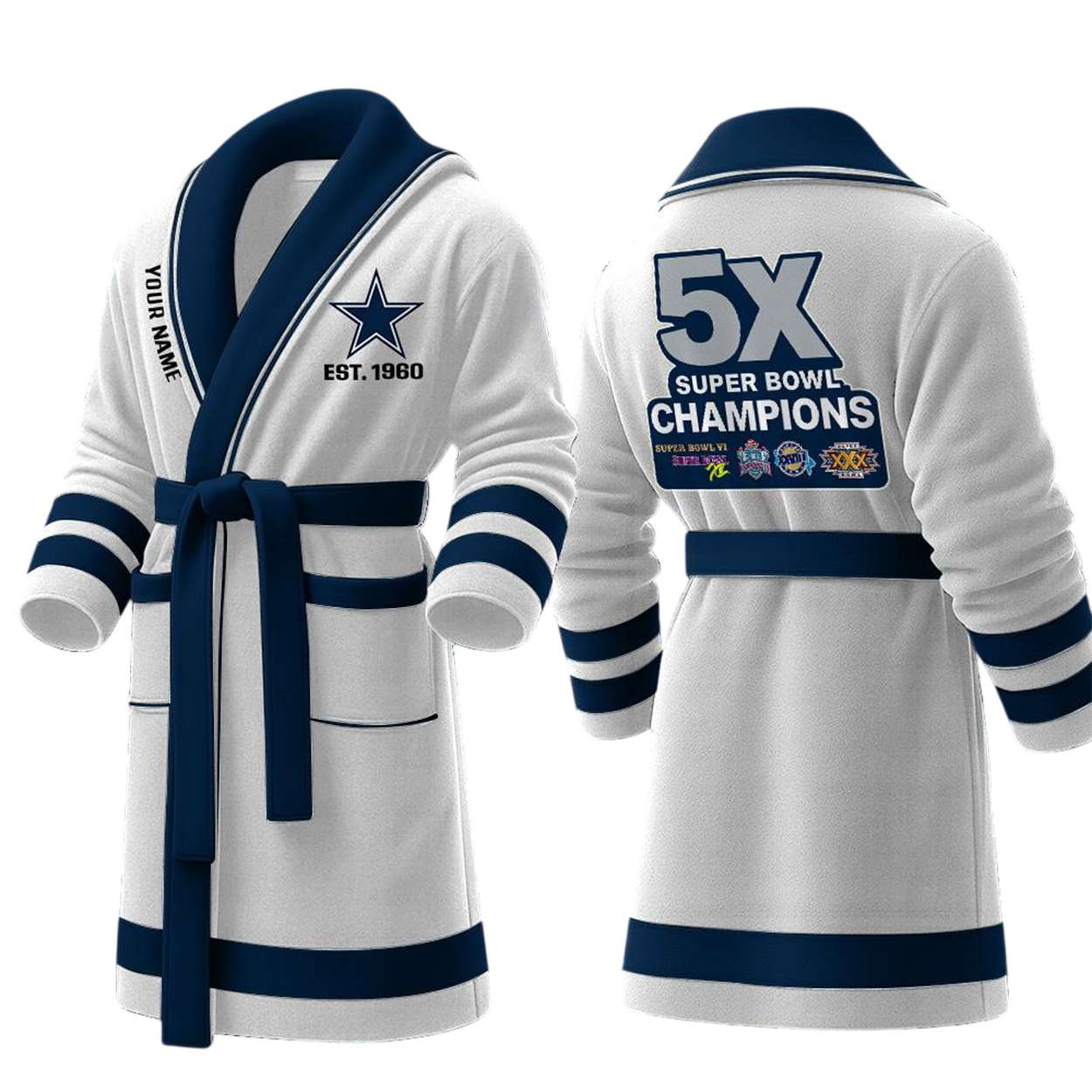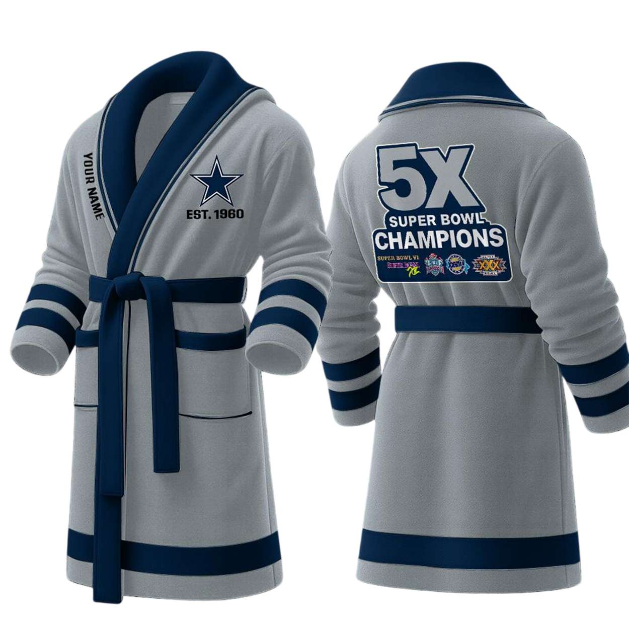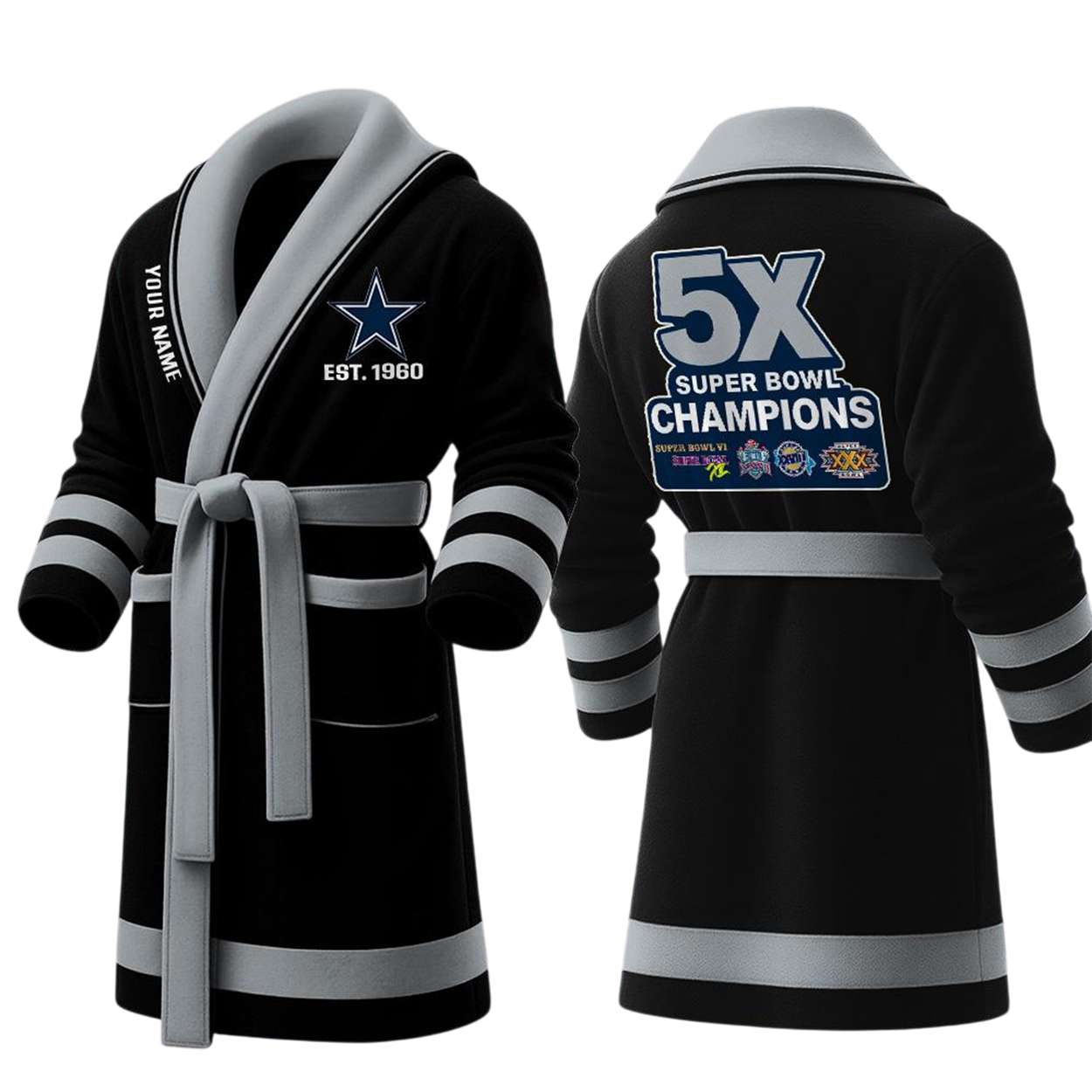 Show your pride with the Personalized Cowboys Est 1960 5X SB Champions Fleece Bathrobe. Featuring legendary Super Bowl wins and iconic Dallas history, this robe connects fans to unforgettable moments, heroic players, and the enduring spirit of America’s Team.