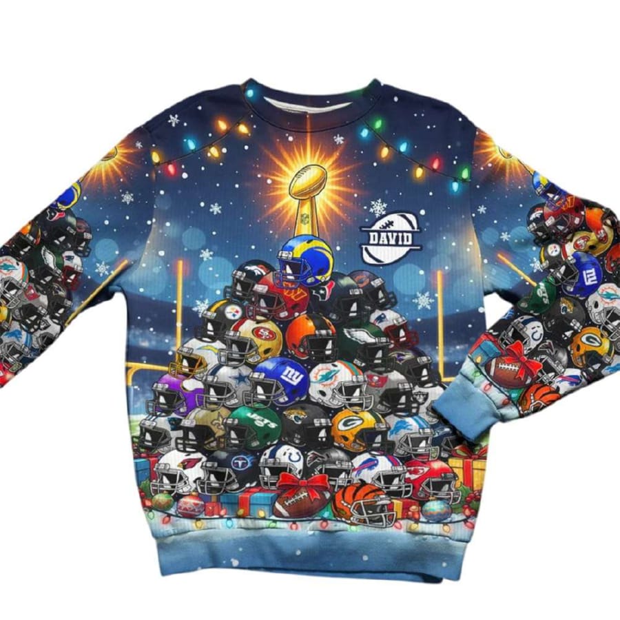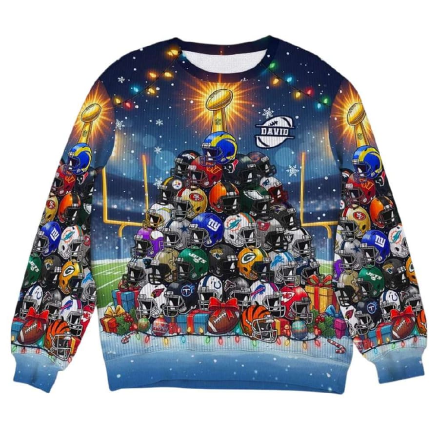 Delight football enthusiasts with the Personalized Gifts For American Football Lovers Christmas Ugly Sweater. Featuring iconic football helmets stacked like a festive tree, it captures the spirit of team rivalries, family traditions, and holiday magic. Perfect for fans who value history, teamwork, and the thrill of the game during the Christmas season.