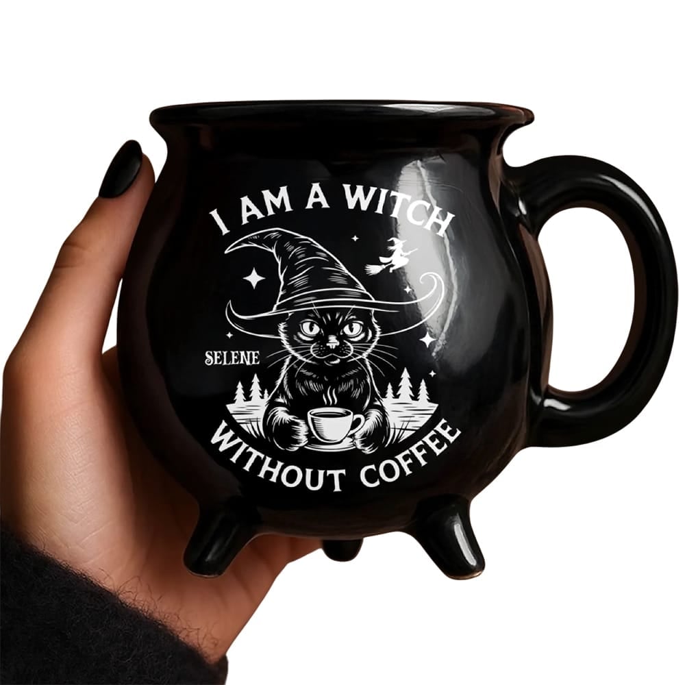 Personalized Witch’s Cauldron Mug – “I Am a Witch Without Coffee” Black Cat Edition