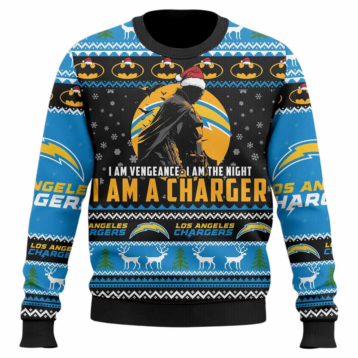 Batman’s timeless mantra—“I am vengeance. I am the night.”—echoes through this electrifying sweater, merging Gotham’s dark protector with the fierce energy of the Los Angeles Chargers. It’s a tribute to resilience, identity, and the power of standing for something greater.
