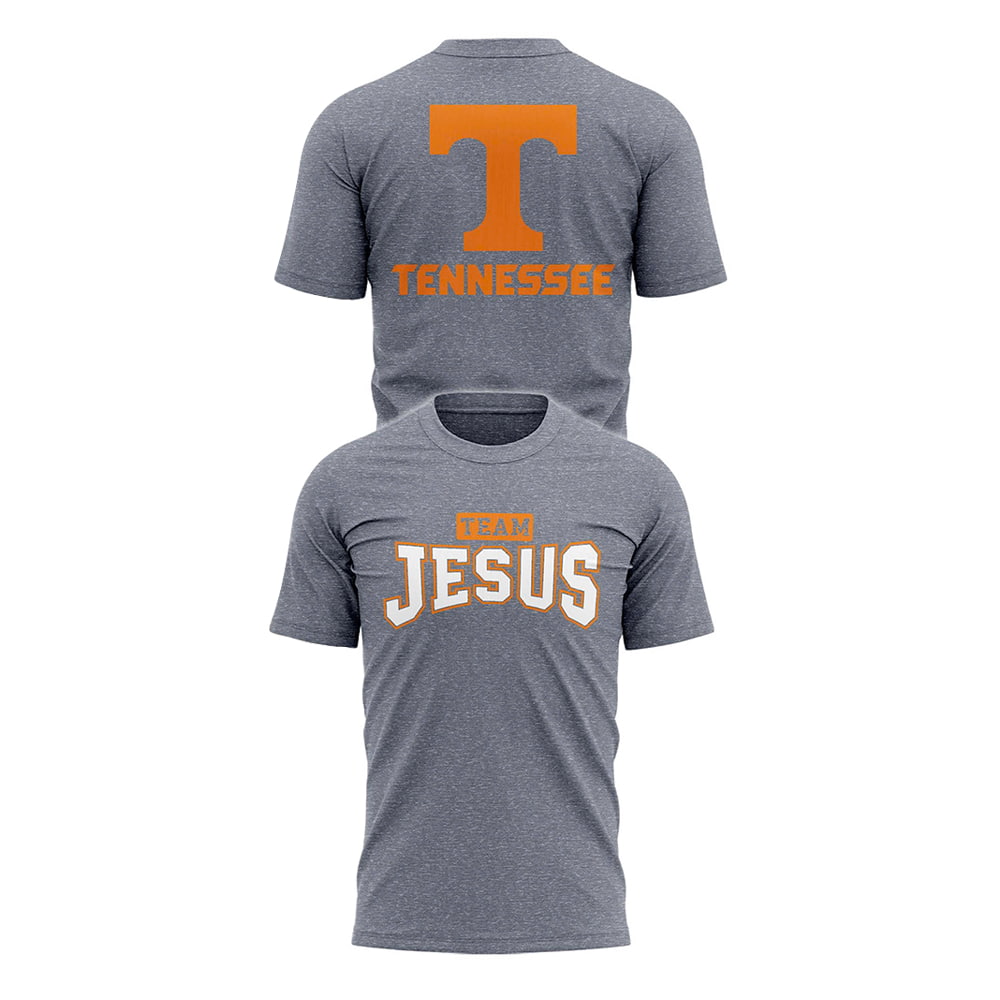 The straightforward “TEAM JESUS” declaration speaks to unwavering spiritual conviction, and the iconic orange “T” coupled with “TENNESSEE” ties that faith to the proud tradition of Vols football, uniting believers and fans under one banner.