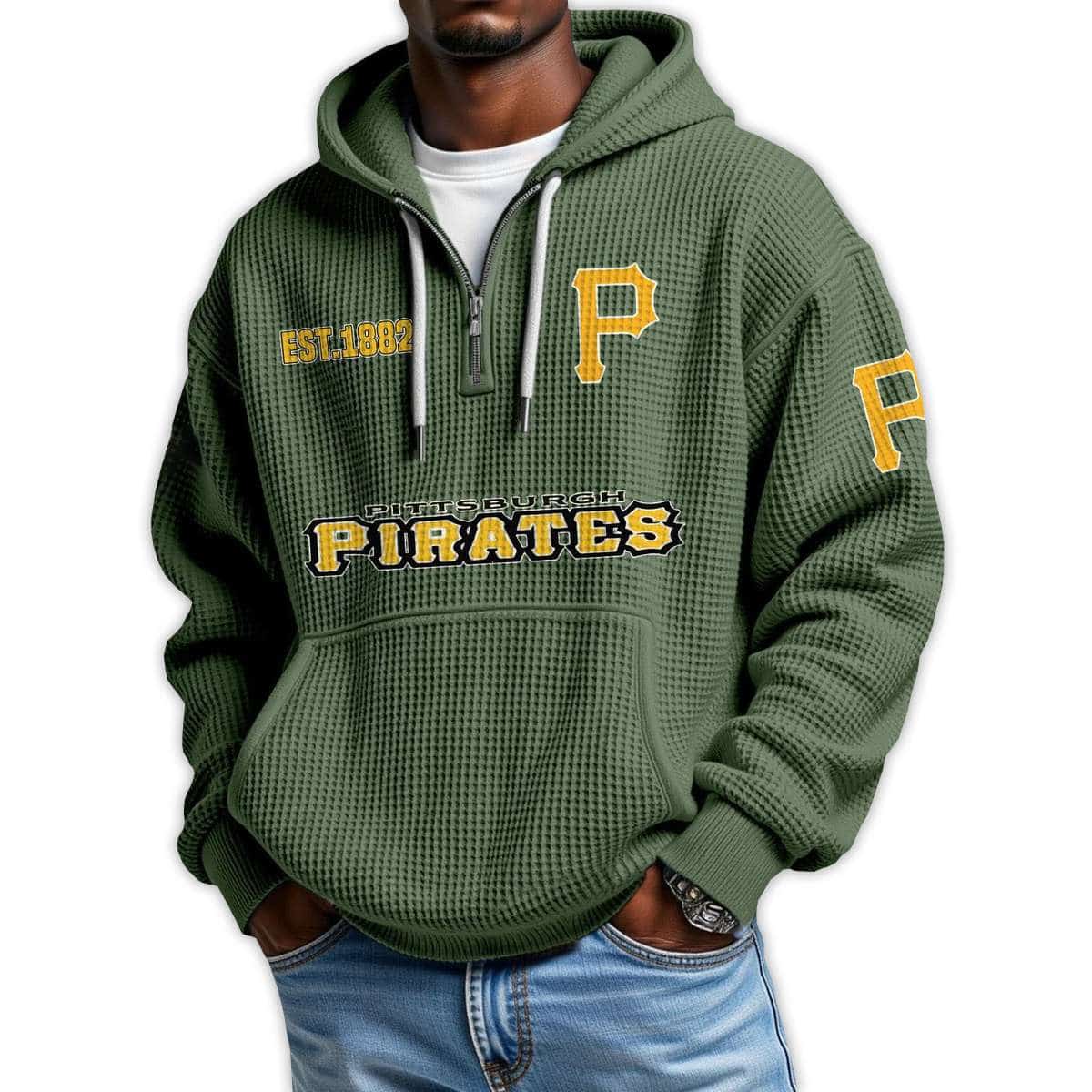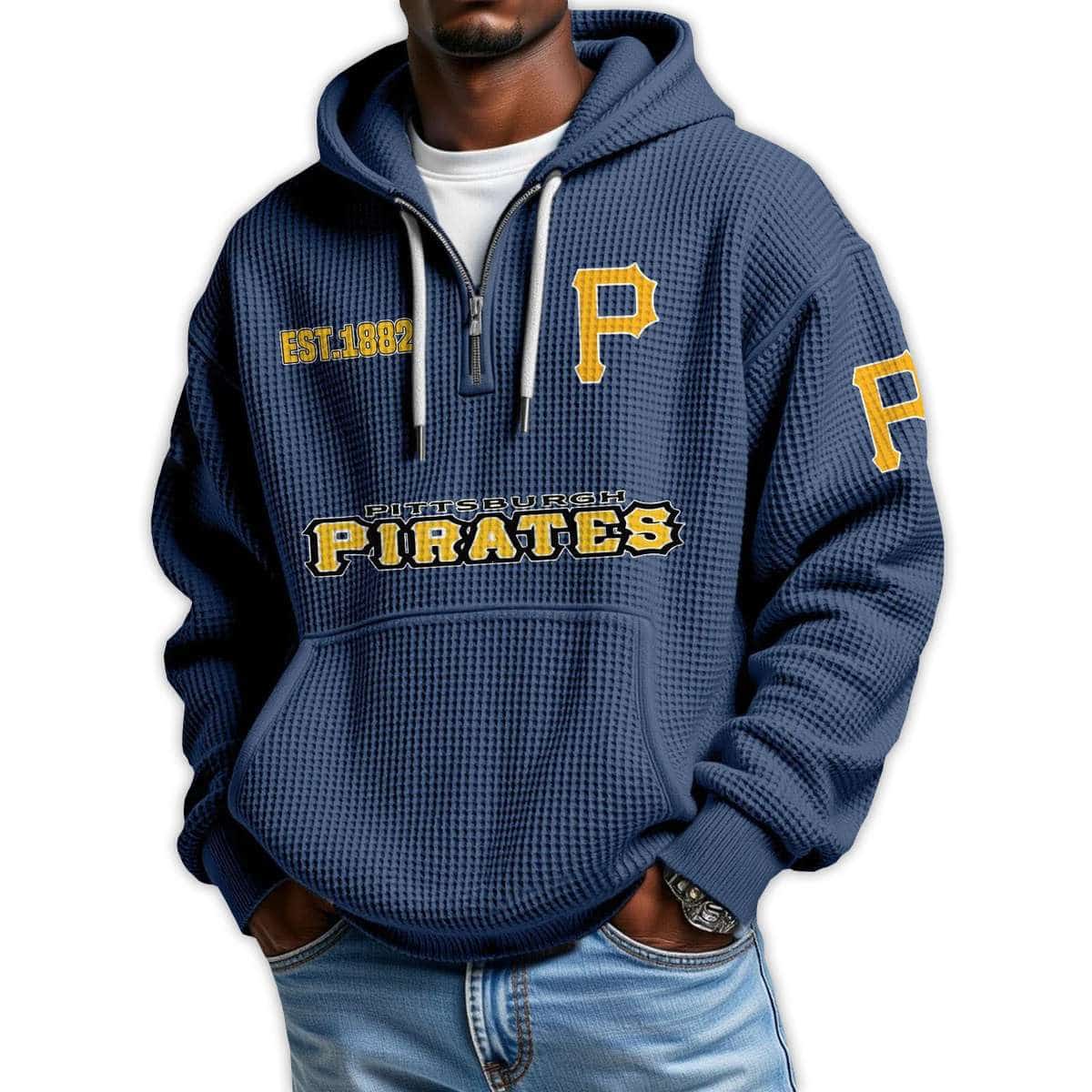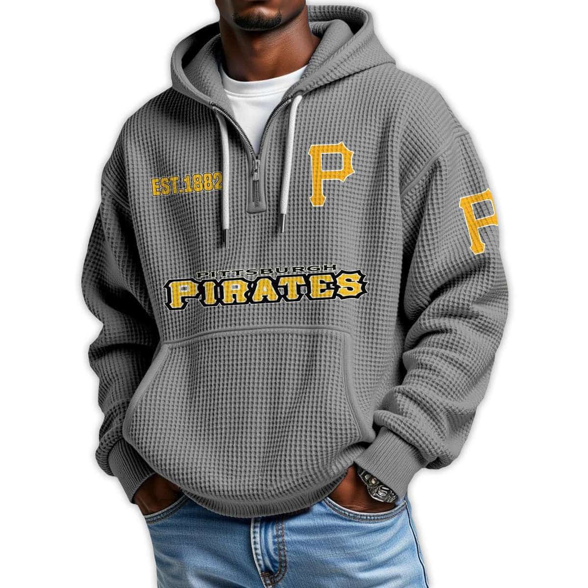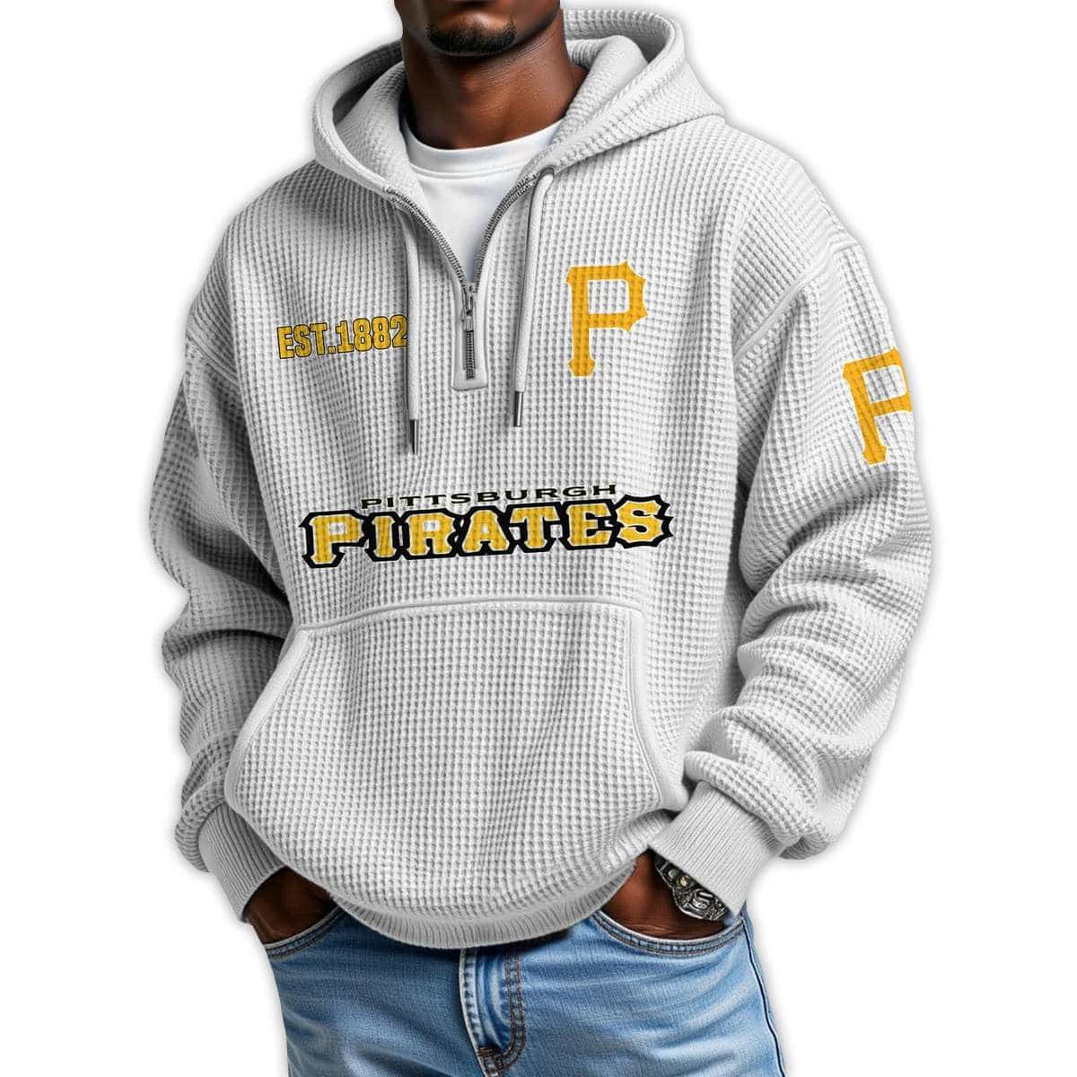 Show your Pittsburgh pride with the Pirates Est 1882 Quarter Zip Waffle Hoodie. Featuring historic emblems and bold graphics, this hoodie connects fans to the legacy of one of baseball’s oldest franchises and the unforgettable players who shaped its enduring story.