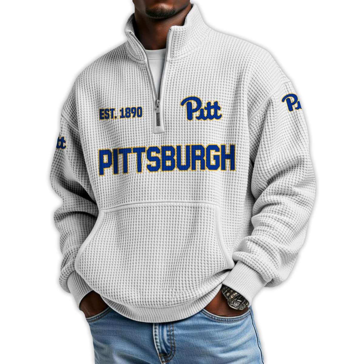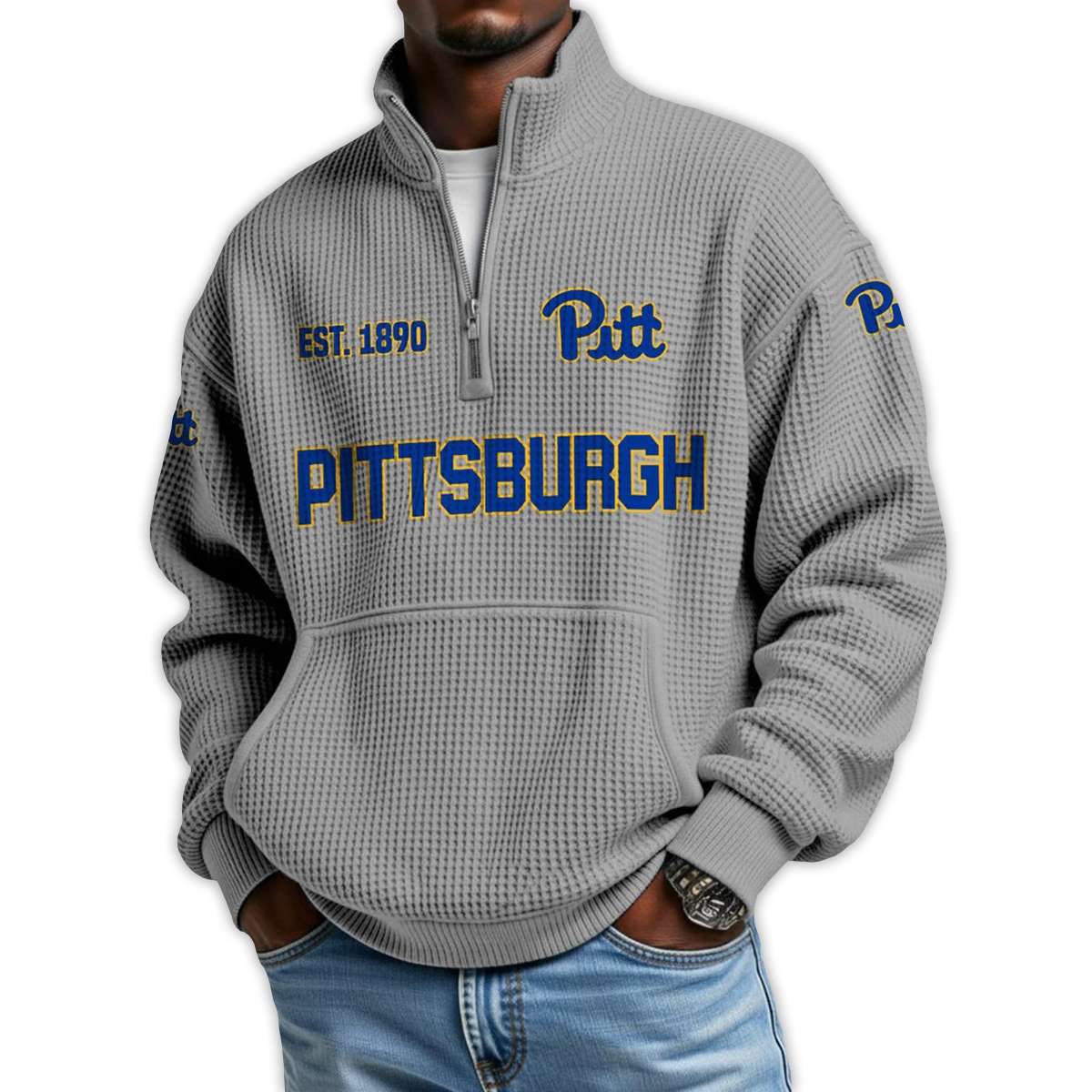 Show your pride in Pittsburgh football with the Pittsburgh Football Est 1890 Waffle Stand Collar Half Zip Sweatshirt. Featuring bold collegiate graphics and historic references, this pullover connects fans to a legacy of grit, iconic athletes, and the enduring spirit of Pennsylvania sports culture.