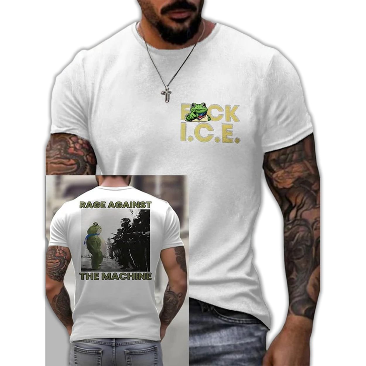 On the back, the phrase “Rage Against The Machine” references the 1990s protest band known for confronting systemic injustice. The juxtaposition of the frog facing armored figures mirrors real demonstrations that shaped cultural consciousness worldwide.