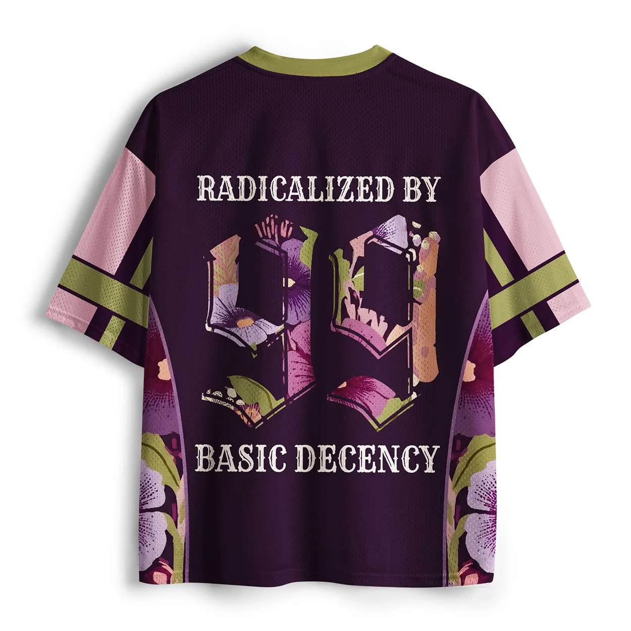 Discover the Radicalized By Basic Decency Mesh Jersey, a bold design merging floral artistry with socially conscious messaging. Featuring vibrant colors and powerful text, this jersey connects fashion to activism, community resilience, and the enduring call for dignity and fairness.