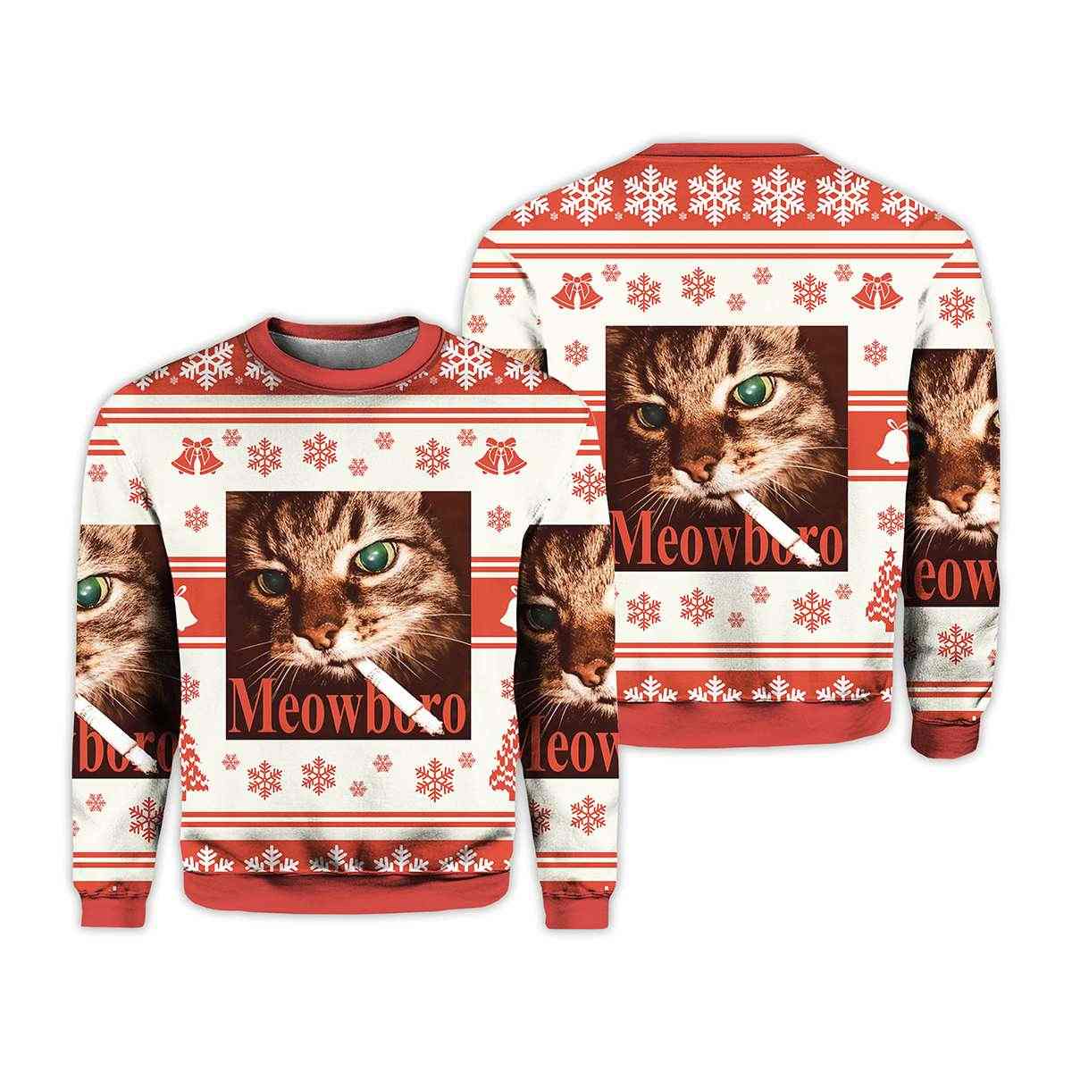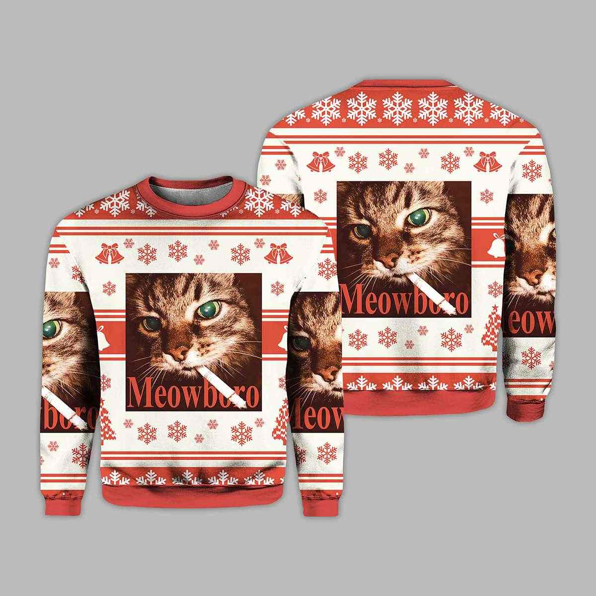 Red Meowlboro Smoking Cat Christmas Ugly Sweater – Satirical Holiday Mischief