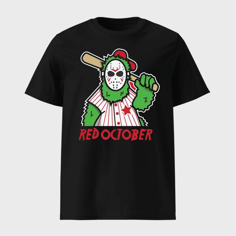 The shirt features the iconic Phillie Phanatic reimagined with a Jason Voorhees twist—donning a hockey mask and wielding a bat like a slasher in cleats. This mashup nods to the October baseball frenzy, where legends are made and rivalries intensify.
