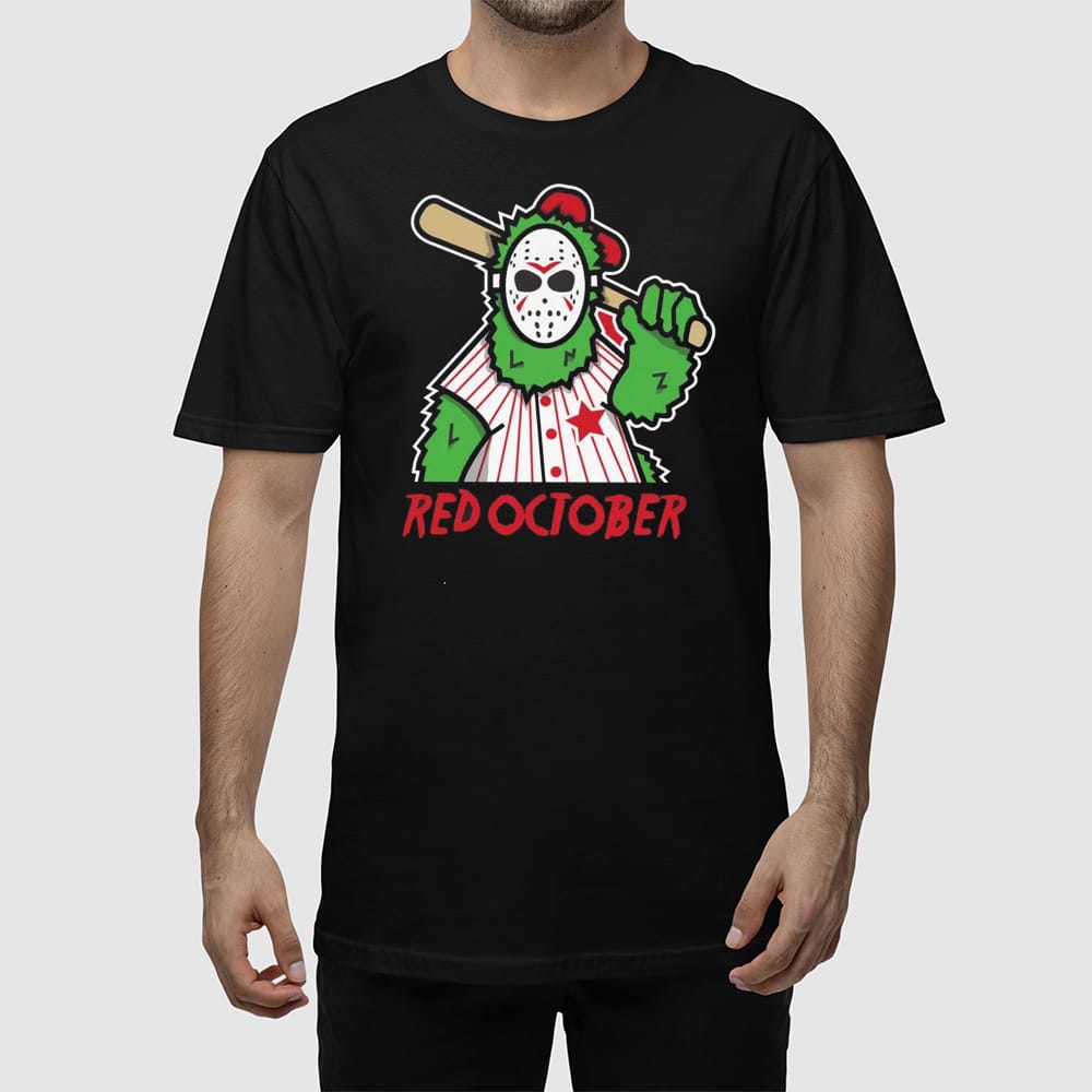 Unleash the wild side of Philly fandom with the Red October Phanatic Halloween Jason Shirt. A fusion of sports, horror, and pop culture—this bold design channels playoff energy, mascot madness, and Halloween grit into one unforgettable graphic.