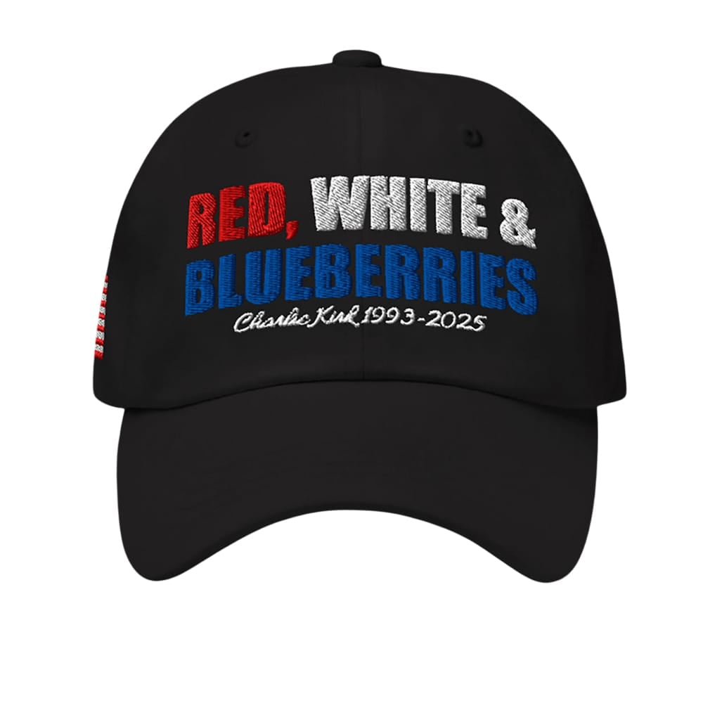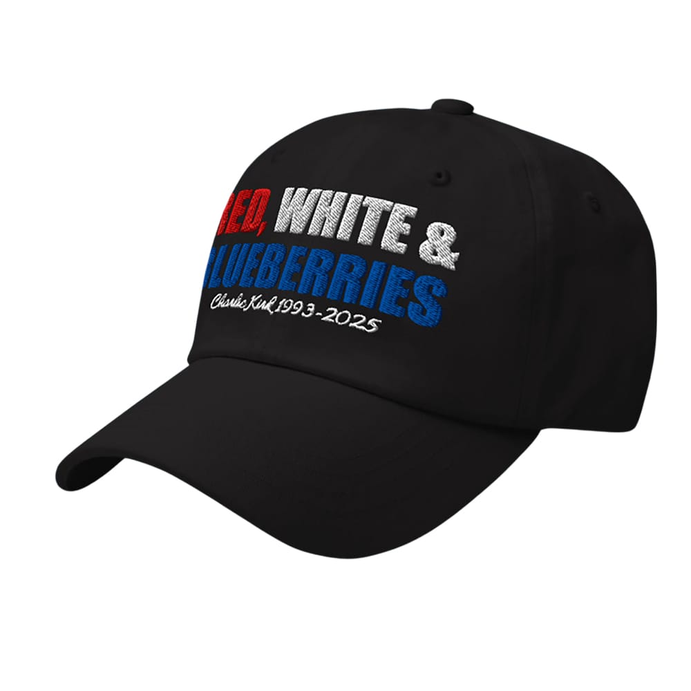 Emblazoned with bold red, white, and blue embroidery, the hat reflects the patriotic spirit that Kirk championed throughout his life. The design subtly incorporates the phrase “Red, White & Blueberries,” paying homage to Kirk’s dedication to American ideals and his tragic end.