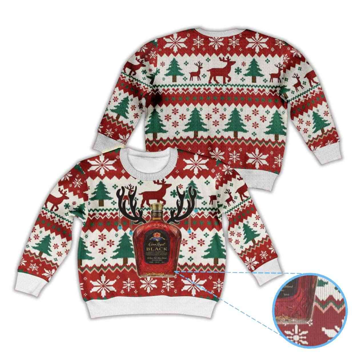 Adorned with prancing reindeer, evergreen trees, and crisp snowflakes, this sweater recalls long nights by the fire and laughter echoing through snowy streets. At its heart stands the Crown Royal Black bottle — symbol of camaraderie, heritage, and the fine art of raising spirits together when the cold settles in.
