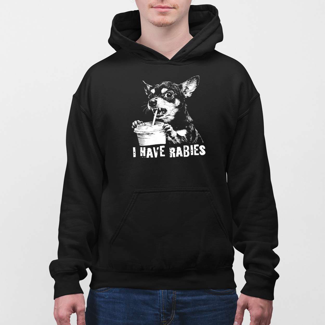 This shirt showcases a quirky Chihuahua illustration paired with the phrase “I Have Rabbies,” creating a humorous yet thought-provoking design. The exaggerated expression of the dog recalls the tradition of using animals in art to highlight human emotions and social issues.