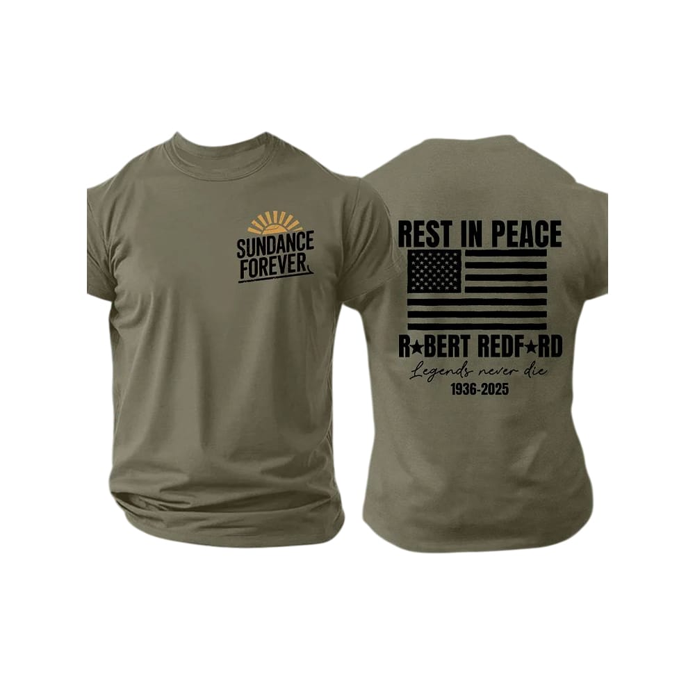 This memorial shirt commemorates the life and career of Robert Redford, a Hollywood legend who passed away at 89. Known for iconic roles in films like Butch Cassidy and the Sundance Kid and The Sting, Redford’s influence on cinema is unparalleled.