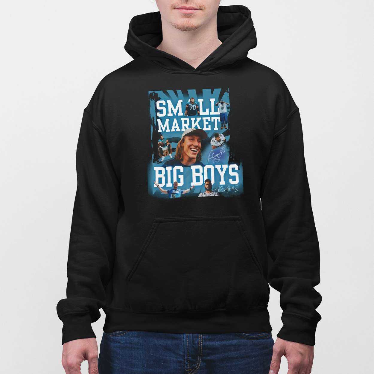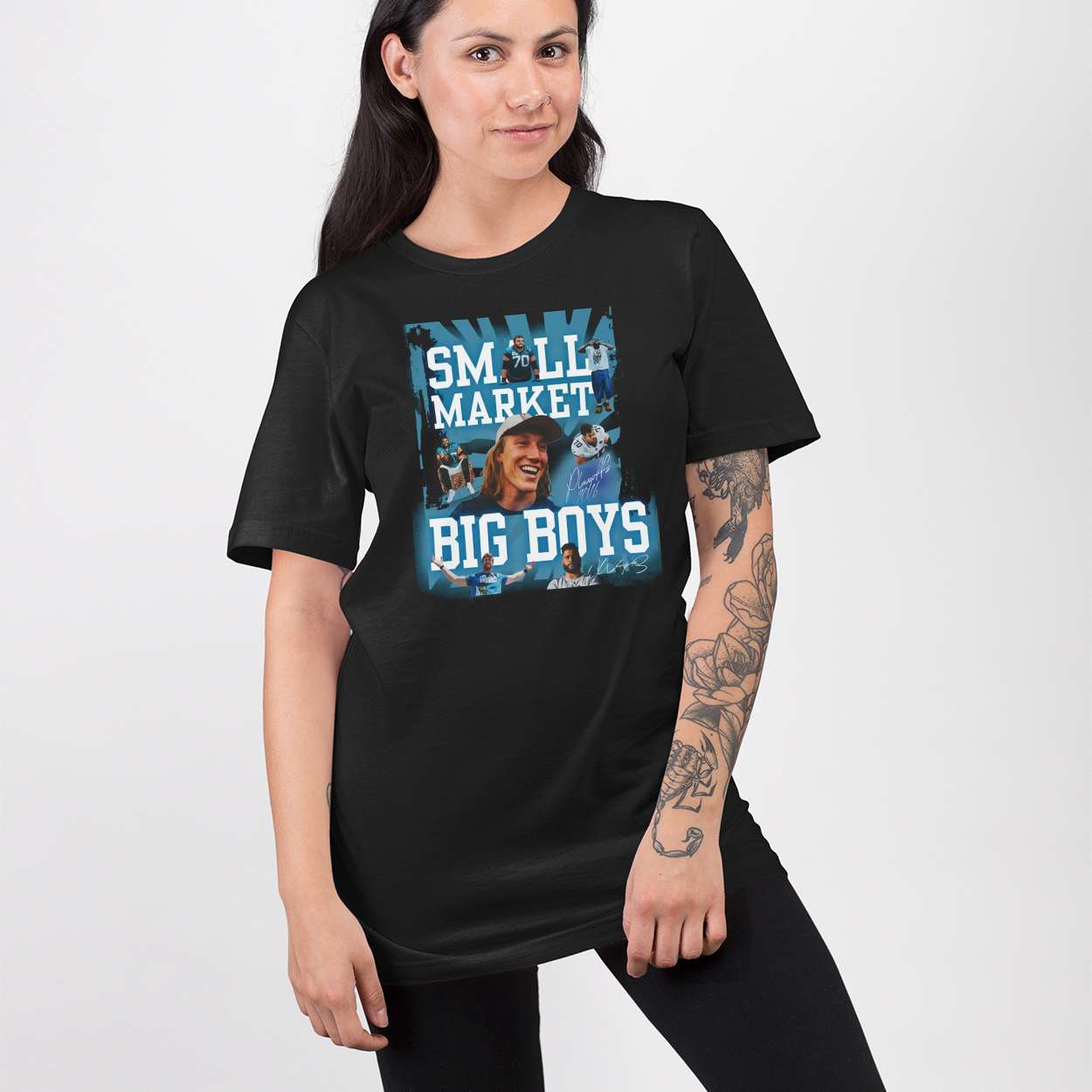 This shirt showcases Robert Hainsey and his offensive line crew in dynamic poses, capturing the swagger and strength that powered Jacksonville’s playoff surge. The phrase “Small Market Big Boys” flips the narrative, spotlighting talent that thrives beyond major media hubs.