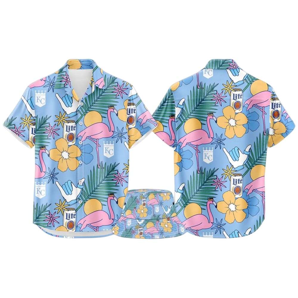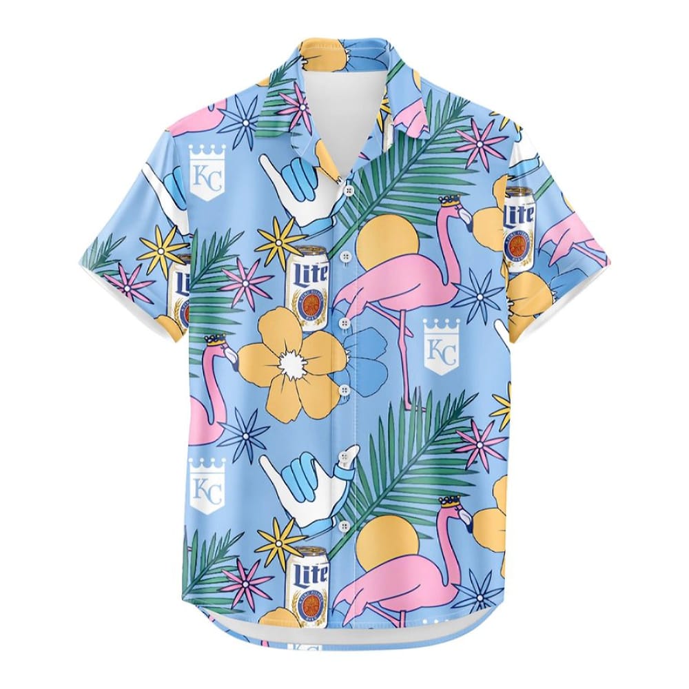 Celebrate Royals Hawaiian Shirt Night 2025 with a vibrant shirt that captures the spirit of baseball, summer, and cultural nostalgia. Featuring flamingos, palm leaves, hibiscus flowers, Miller Lite cans, and the KC emblem, this shirt tells a story of community and shared traditions. Inspired by Kansas City’s historic connection to summer nights at the ballpark, it’s more than fan apparel—it’s a collectible piece of local history that blends sport, festivity, and iconic design into one unforgettable look.